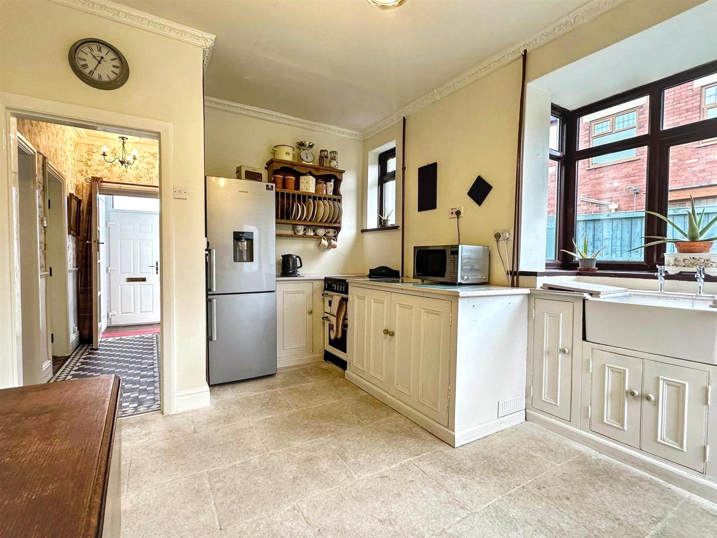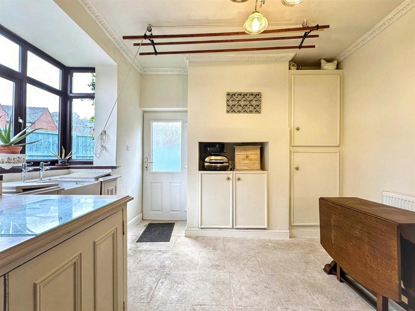 Fitted with a range of wall and base units with work surfaces over, incorporating a Belfast sink unit. Space for fridge freezer, space for cooker, access to boiler. Plumbing for washing machine. Space for dryer. Box bay window to the side aspect. Access to outside. Ceiling light.
