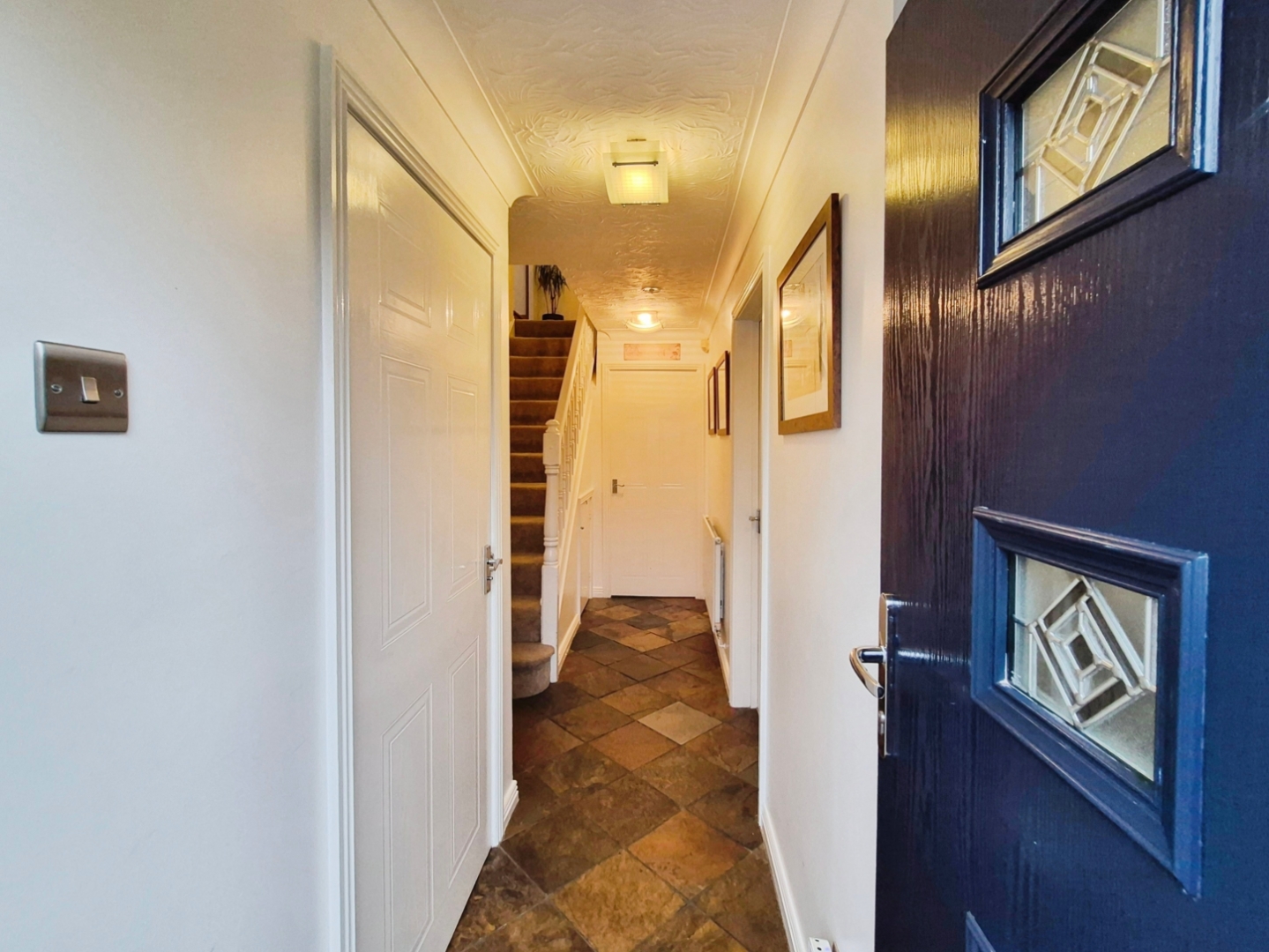 Composite entrance door to the front aspect. Tiled flooring. Radiator. Stairs off leading to the first floor with under stair storage. Ceiling light. Doors leading into:–