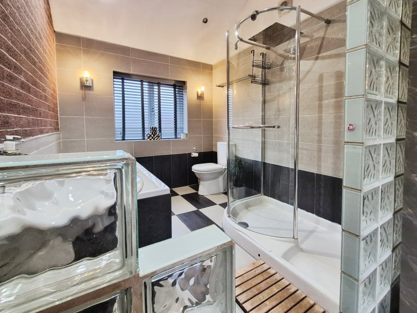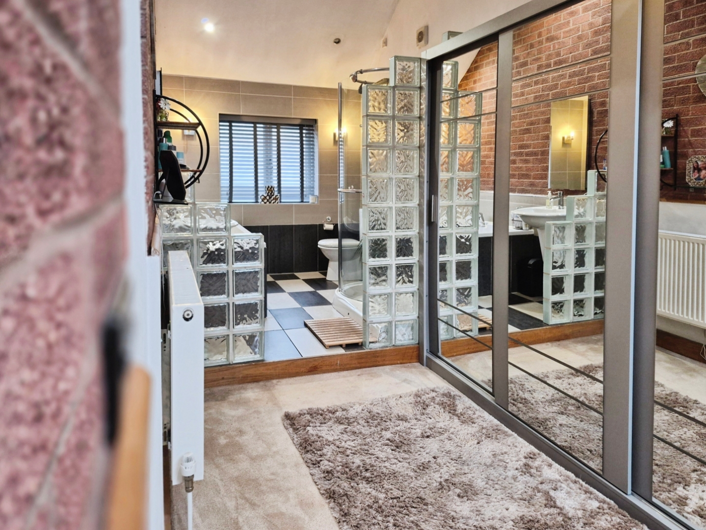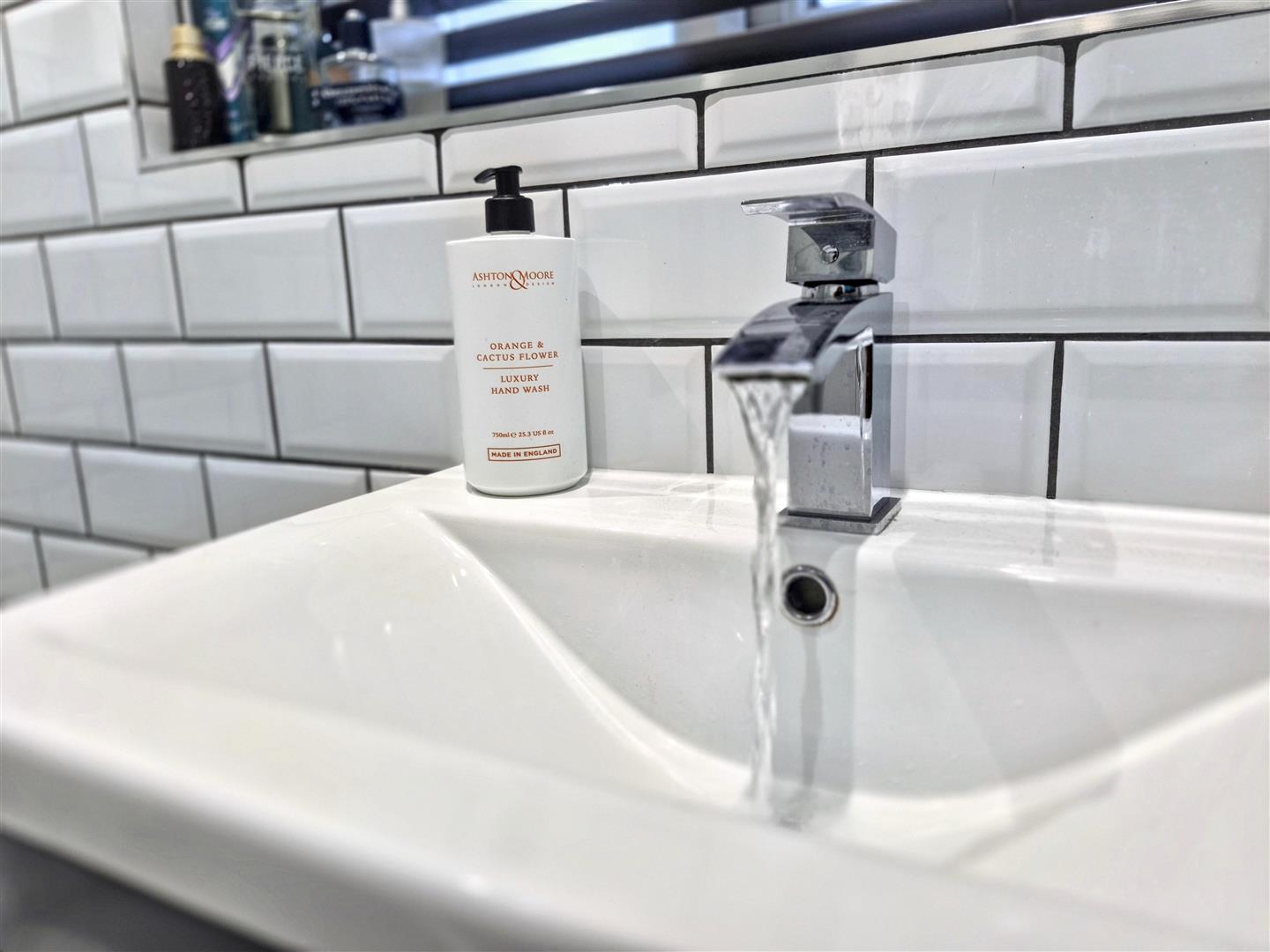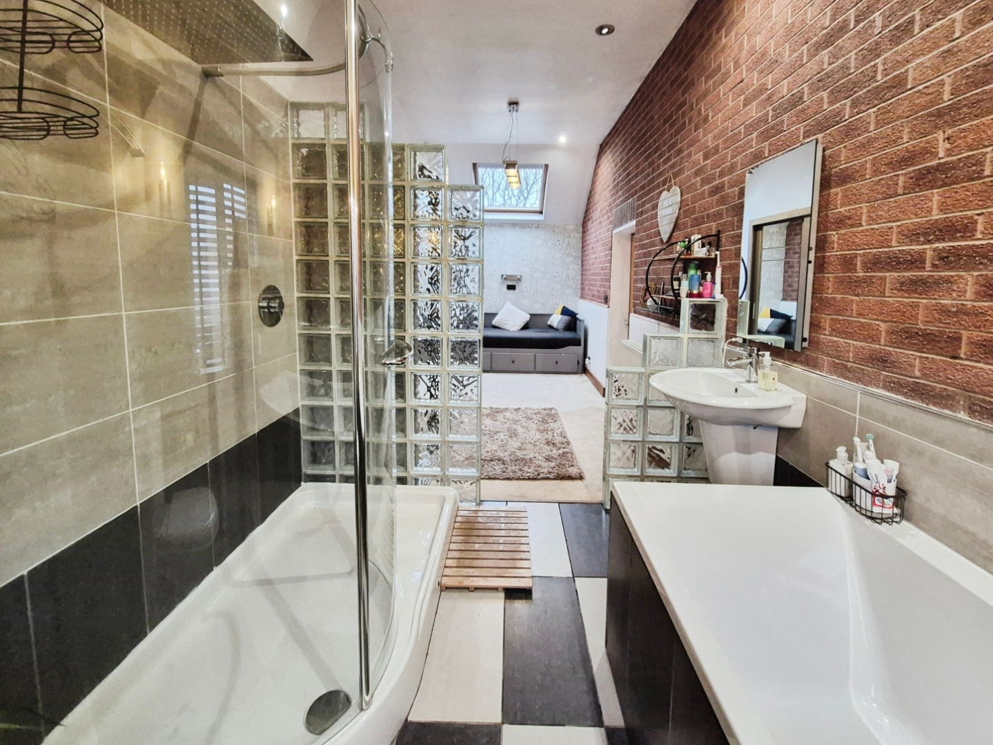 Fitted with a suite comprising of double ended bath with central mixer tap, walk-in shower with rainfall showerhead, low-level WC and wall mounted wash hand basin. Tiled flooring. Part tiled walls. Obscured uPVC window to the front aspect. Ceiling spotlights. Feature exposed brick wall.
