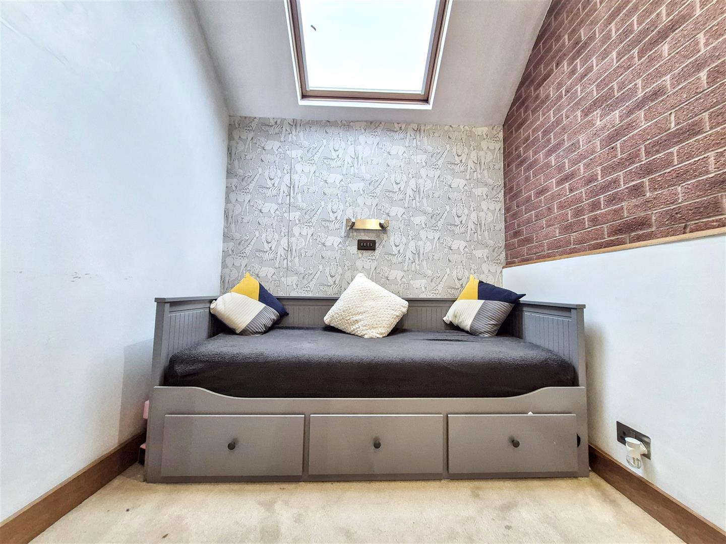Carpet. Radiator. Velux window to the rear aspect. Wall light. Feature exposed brick wall. Ceiling light. Opening into:–