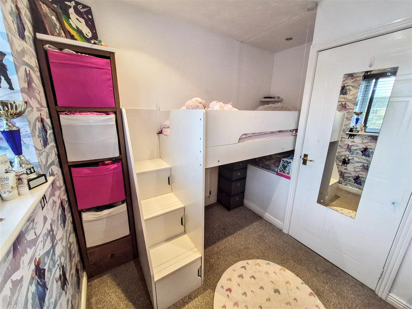 Carpet. Radiator. uPVC windows to the front and side aspects. Large built-in wardrobe with hanging rail, shelf and inset light. Ceiling spotlights. Door leading into:-