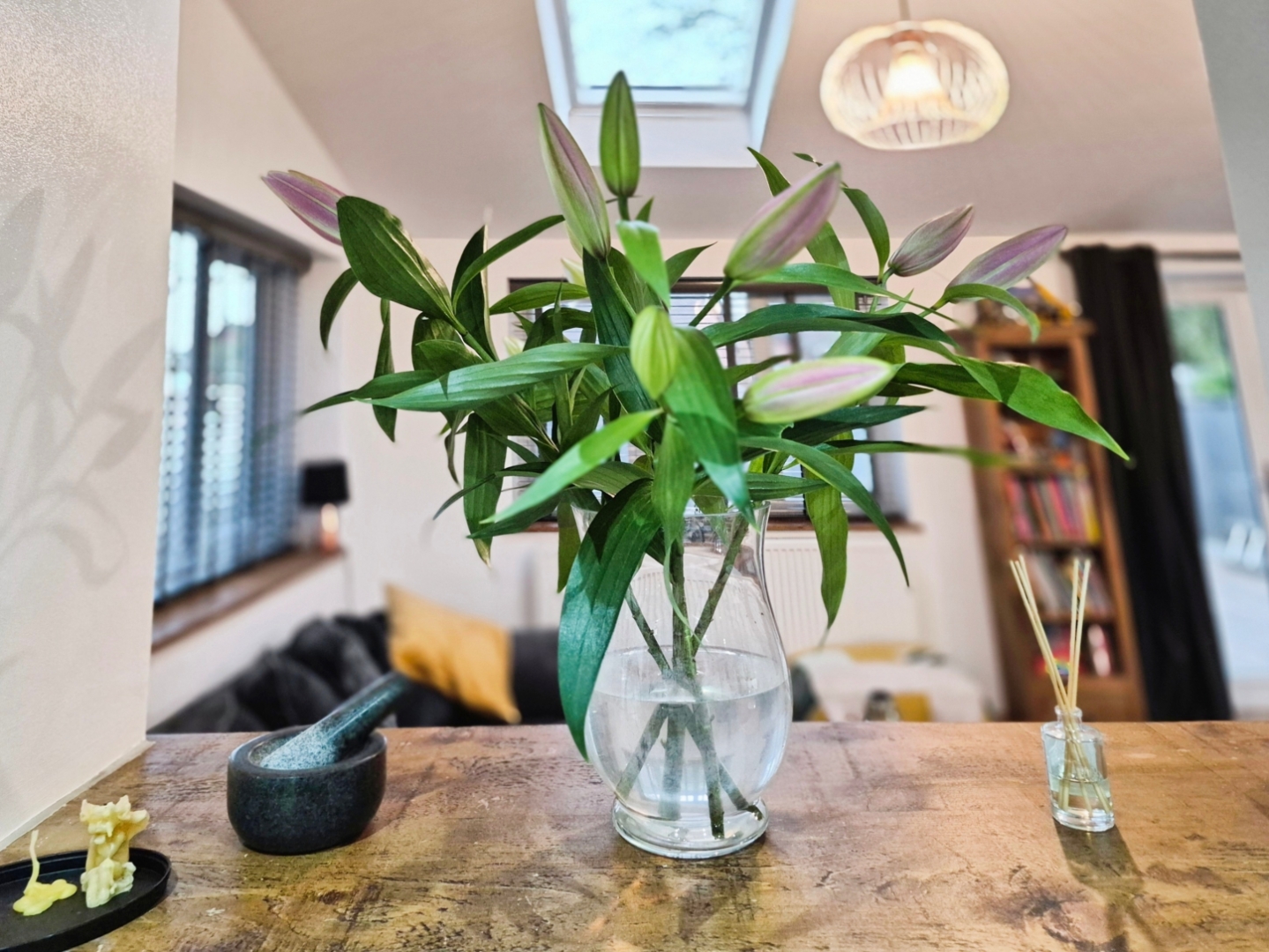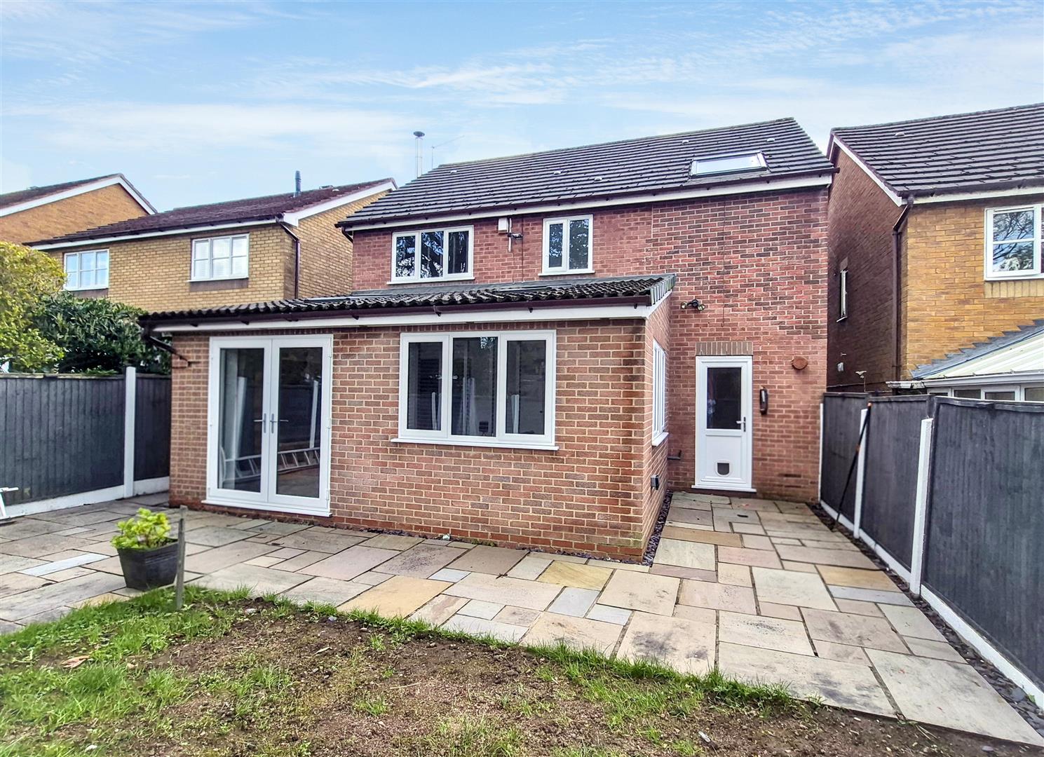 The kitchen opens seamlessly into a generous lounge, a standout feature of the home, enhanced by a semi-vaulted ceiling with Velux windows that flood the space with natural light. French doors lead directly onto the rear garden, further enhancing the sense of space and indoor-outdoor living. A separate utility room sits just off the kitchen, providing additional practicality and access to both the rear garden and the integral garage.