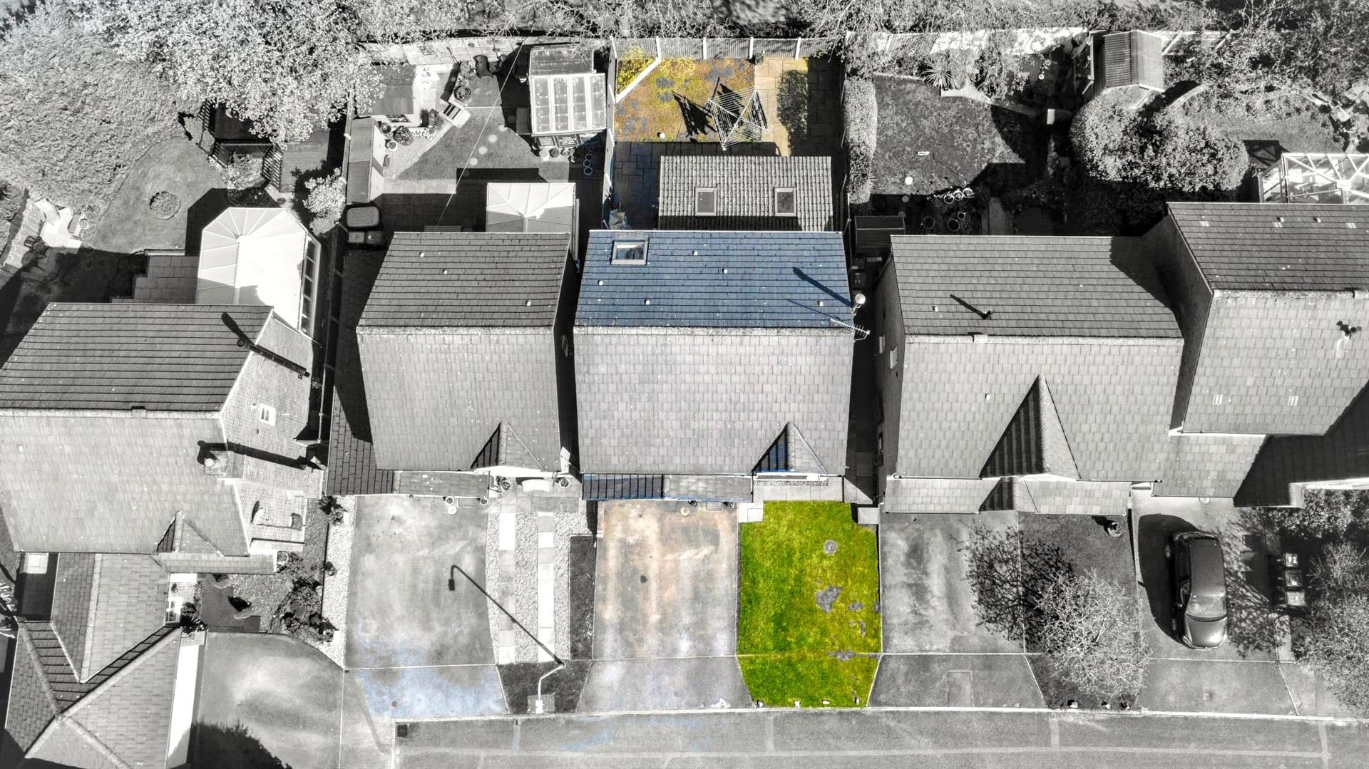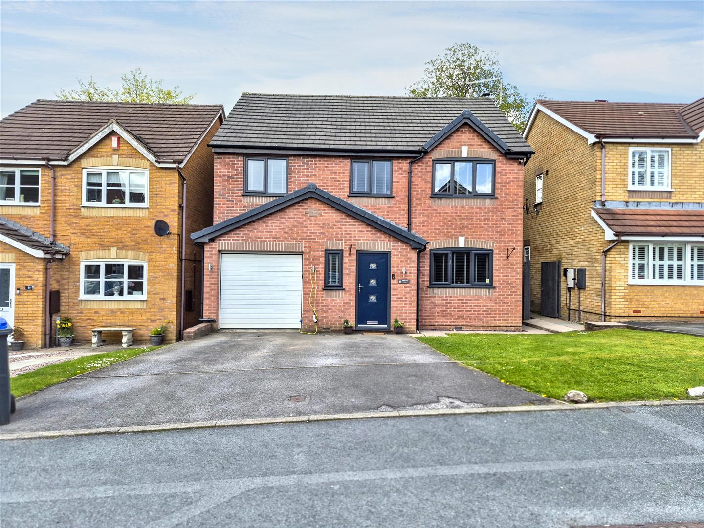 To the front of the property there is a tarmac driveway providing off road parking for two vehicles and leading to an integral single garage. Alongside the driveway there is a small lawned garden area and a pathway leading through gated access at the side, to the rear garden.