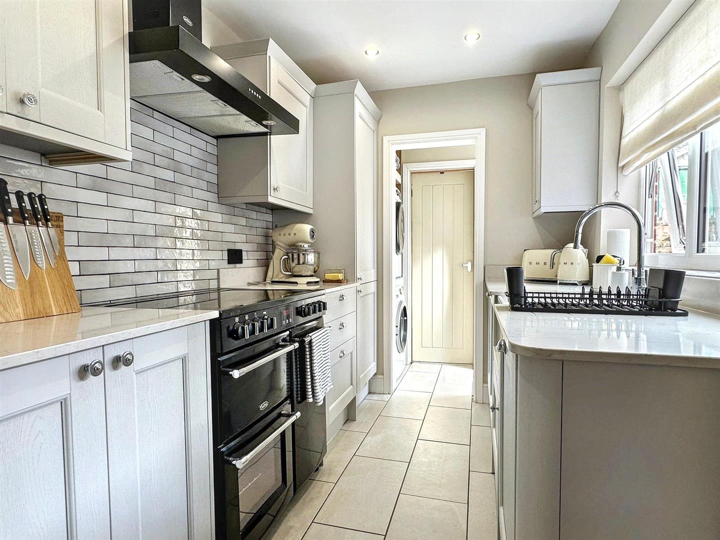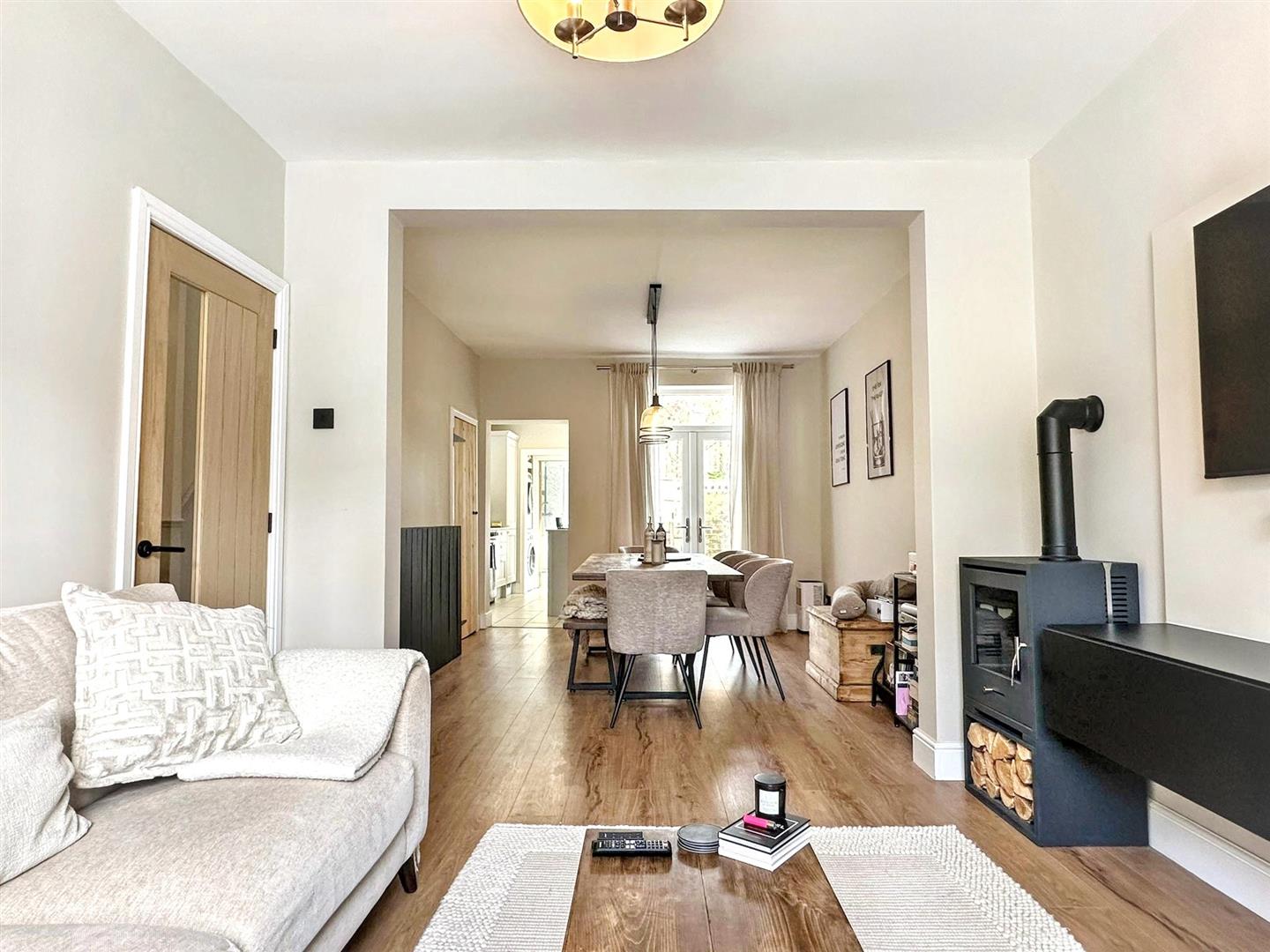 Upon entering the property, you are welcomed by a spacious entrance hallway providing access into a generous open-plan living and dining area. The lounge space is a particularly attractive feature of the home, boasting a charming log burner and stylish wall panelling, creating a warm and inviting atmosphere. Double doors lead from the dining area out to the rear courtyard. The kitchen is accessed directly from the dining area and comprises a well-appointed, extended galley-style layout, offering ample and fitted with quality fixtures and fittings.