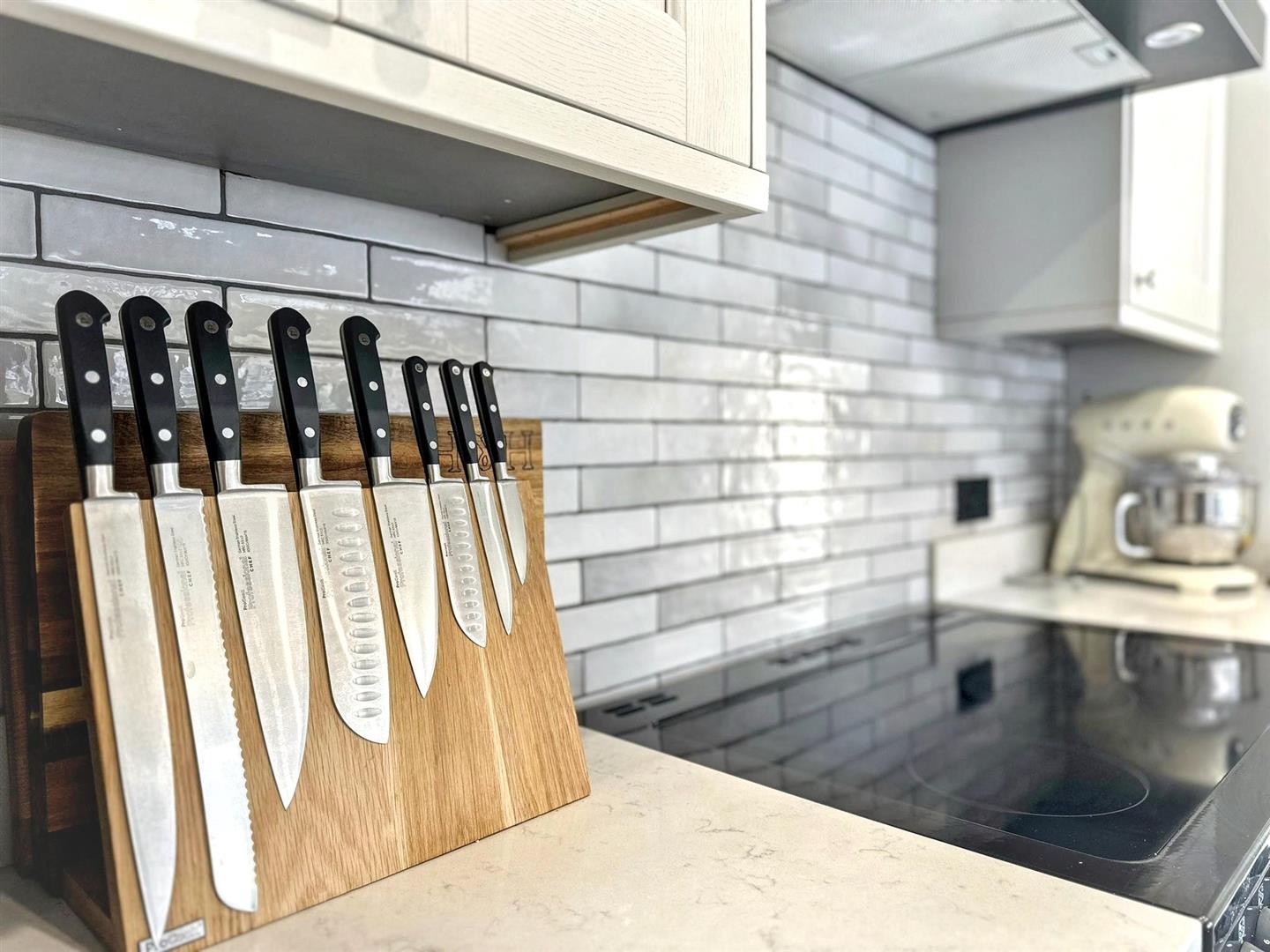 Fitted with a range of wall and base units with work surfaces incorporating a belfast sink unit with mixer tap. Integrated dishwasher and fridge freezer, space for a range style cooker with extractor over. Tiled flooring. uPVC Windows to the side aspect. Inset spotlights.