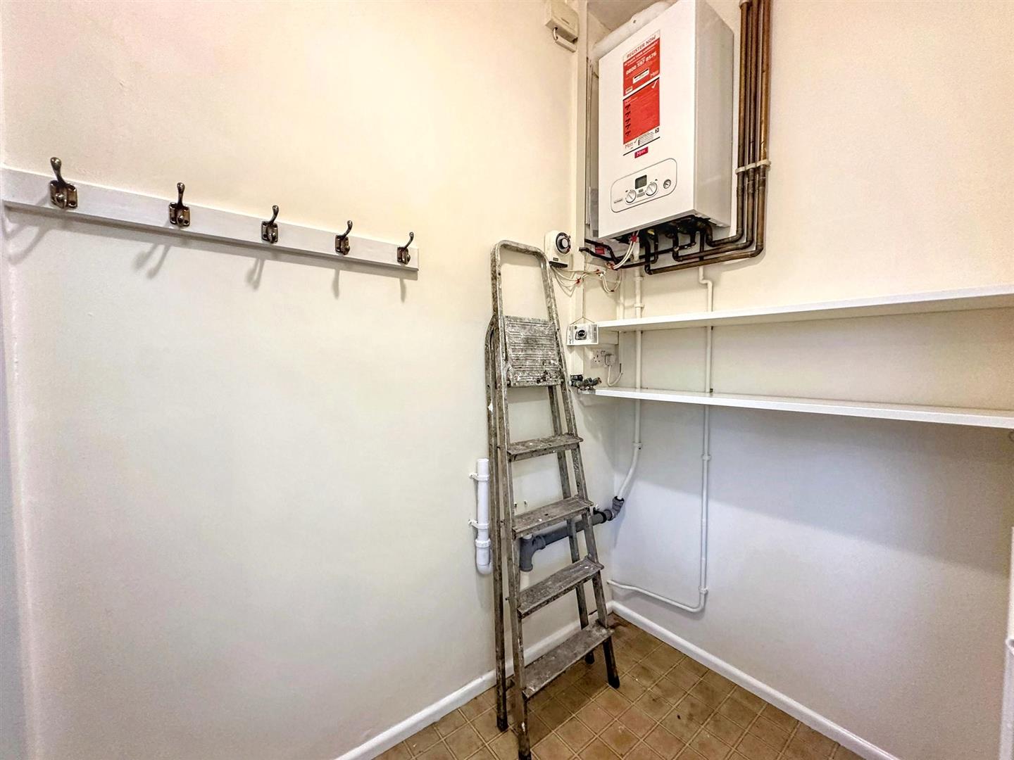 Tiled flooring. Radiator. Boiler. Ceiling light.