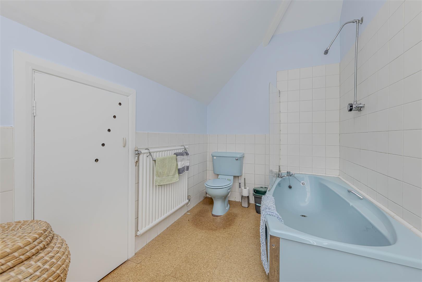 Contains a bath with shower attachment, WC, radiator, pedestal wash hand basin, part-tiled walls, ceiling light, and a uPVC frosted window to the side.
