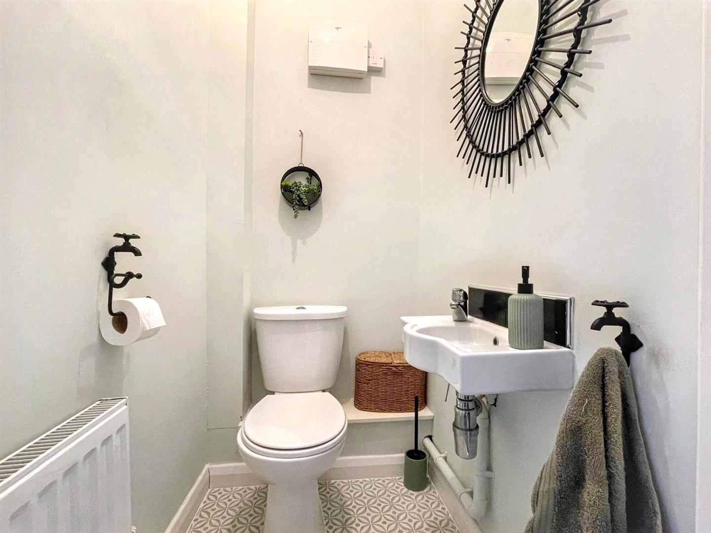 Vinyl flooring. Wall mounted radiator. Low level WC. Wall mounted wash hand basin. Extractor fan. Ceiling light. Consumer unit.