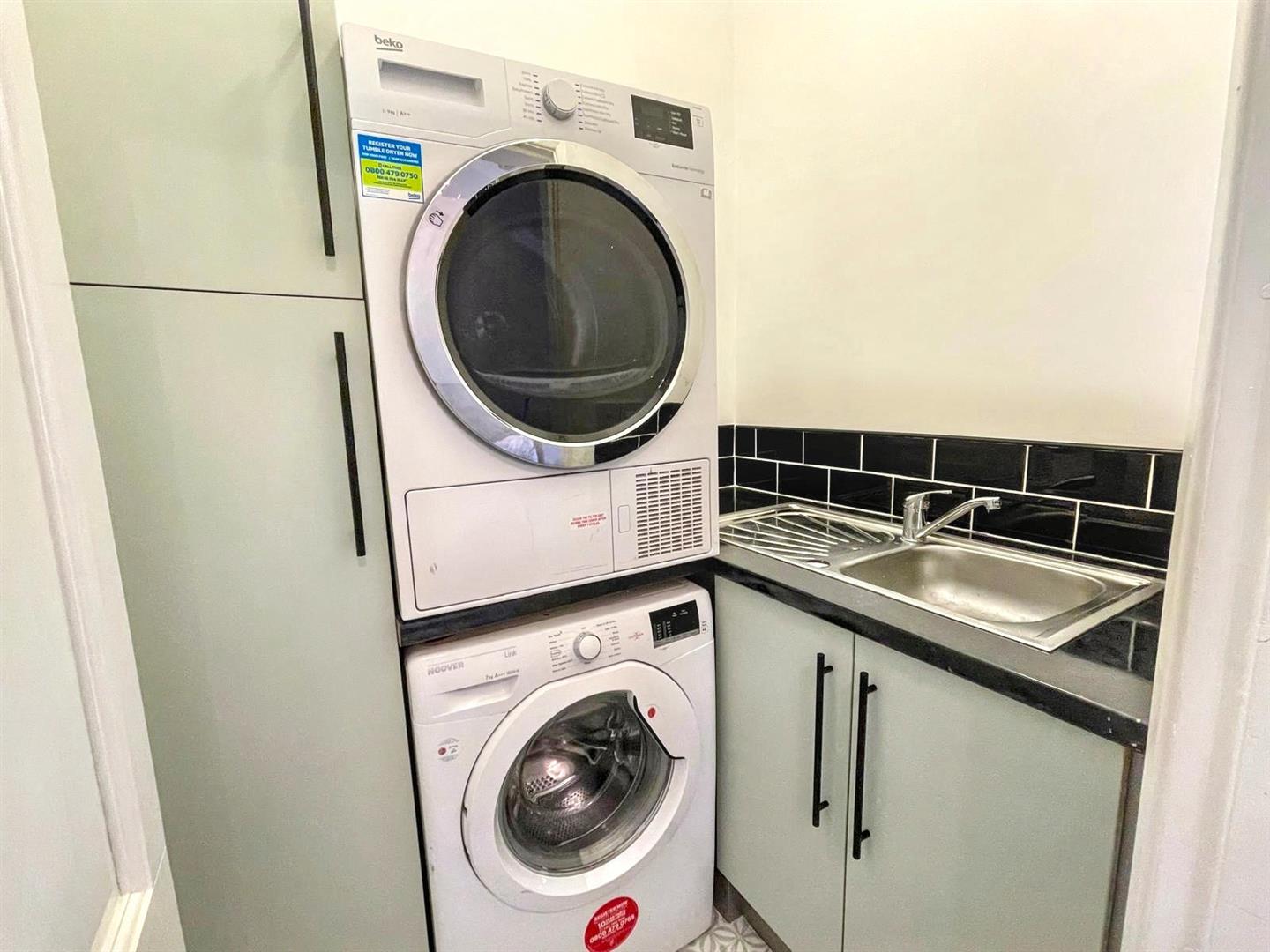 Vinyl flooring. Base units with laminate work top above. Integrated stainless steel sink and drainer unit with mixer tap above. Space for washing machine and tumble dryer. Extractor fan. Ceiling light.