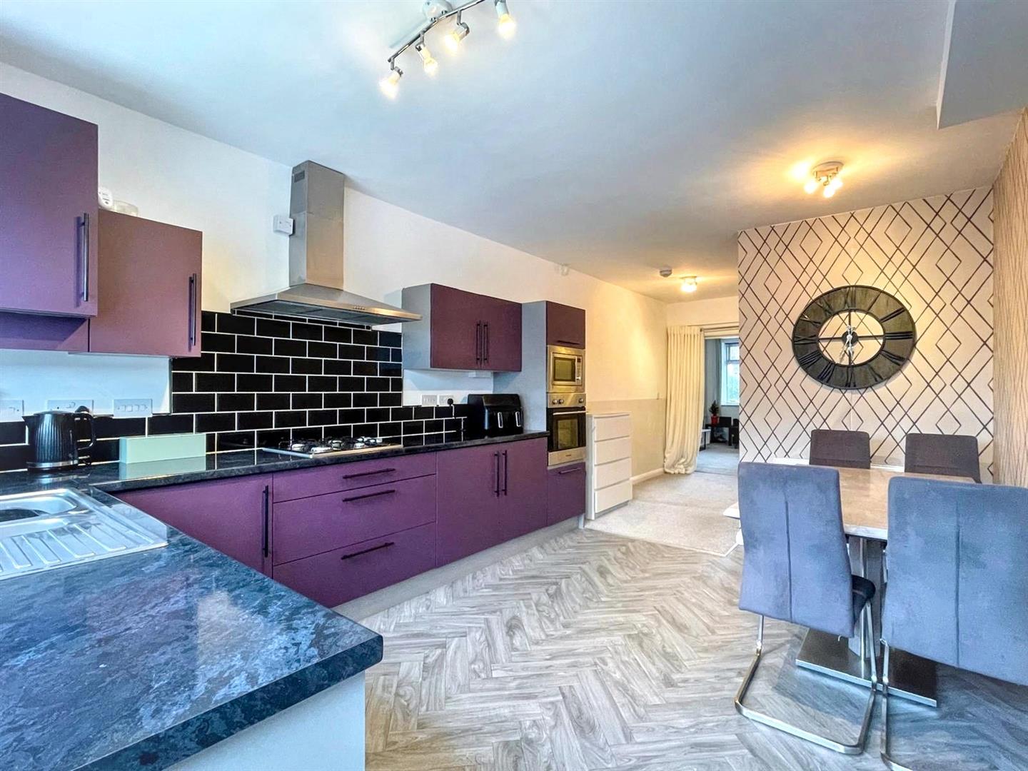 To the rear of the home is a large kitchen diner, perfect for entertaining and everyday living, with direct access to the well-maintained enclosed rear garden. The kitchen is fitted with eye-catching plum-coloured cabinetry complemented by dark worktops, creating a contemporary and inviting space. Additional ground floor accommodation includes a useful utility room and a separate WC.