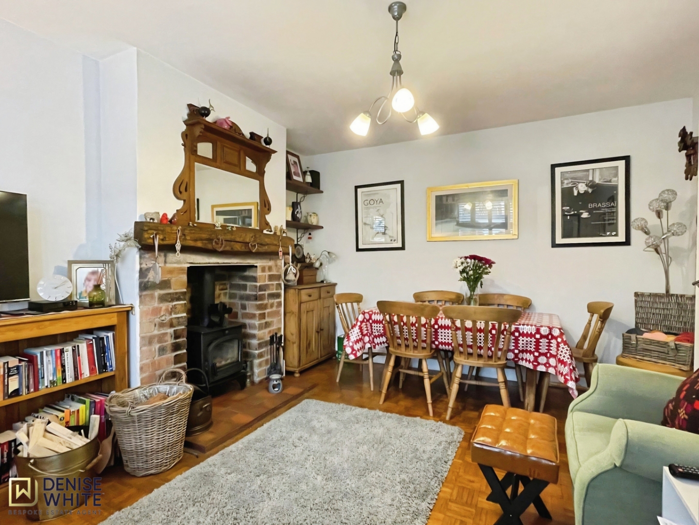 The property welcomes you with a spacious entrance hall, setting a bright and elegant tone. To the front, you’ll find a cosy dining room complete with bespoke shutters, a striking log burner, exposed brick fireplace surround, wooden mantle, and beautifully maintained parquet flooring.
