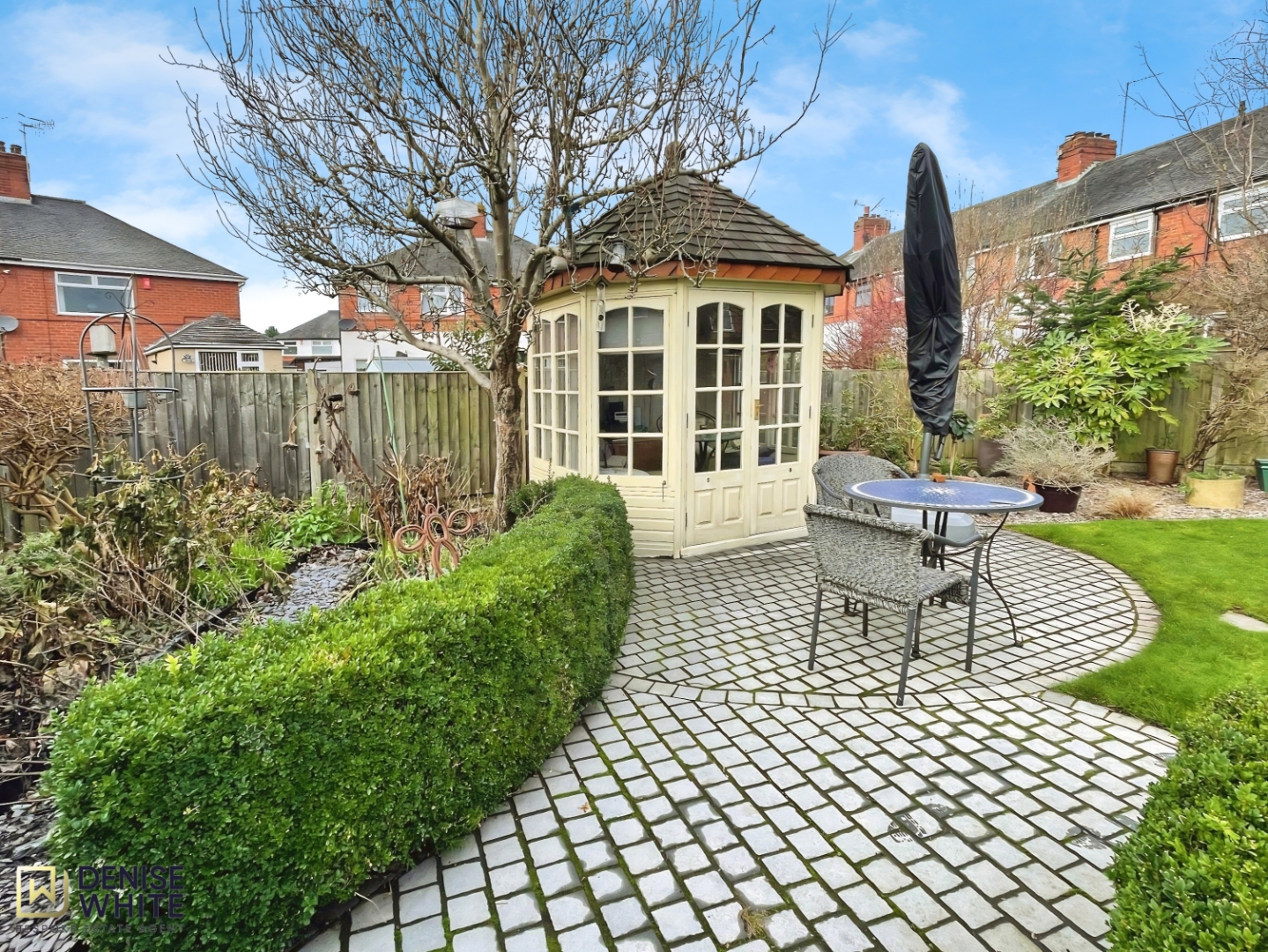 To the rear, the large and impressive garden offers exceptional outdoor space. A stone patio — accessible directly from the living room — provides a perfect spot for dining or relaxing. Beyond lies a generous lawn, well-stocked borders, and a charming cobbled area featuring a summerhouse and useful storage shed.