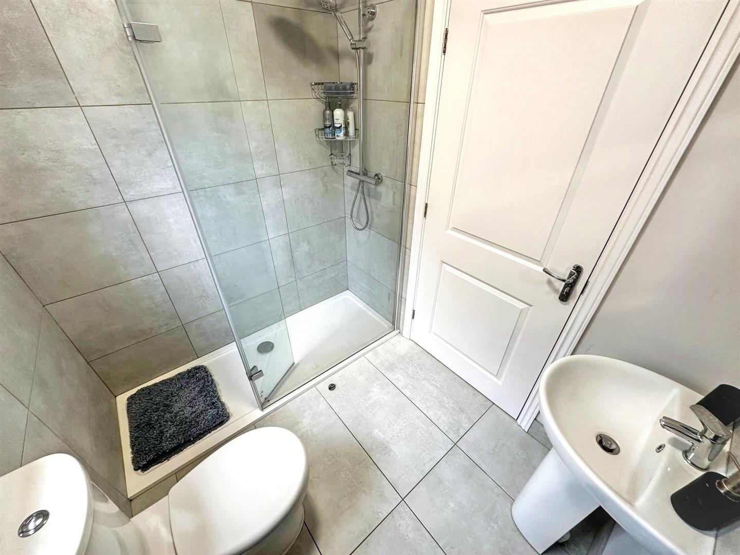 Tiled flooring. Heated towel rail. WC. Pedestal style wash hand basin. Obscured uPVC window. Shower cubicle with rain style shower. Inset Spotlights.