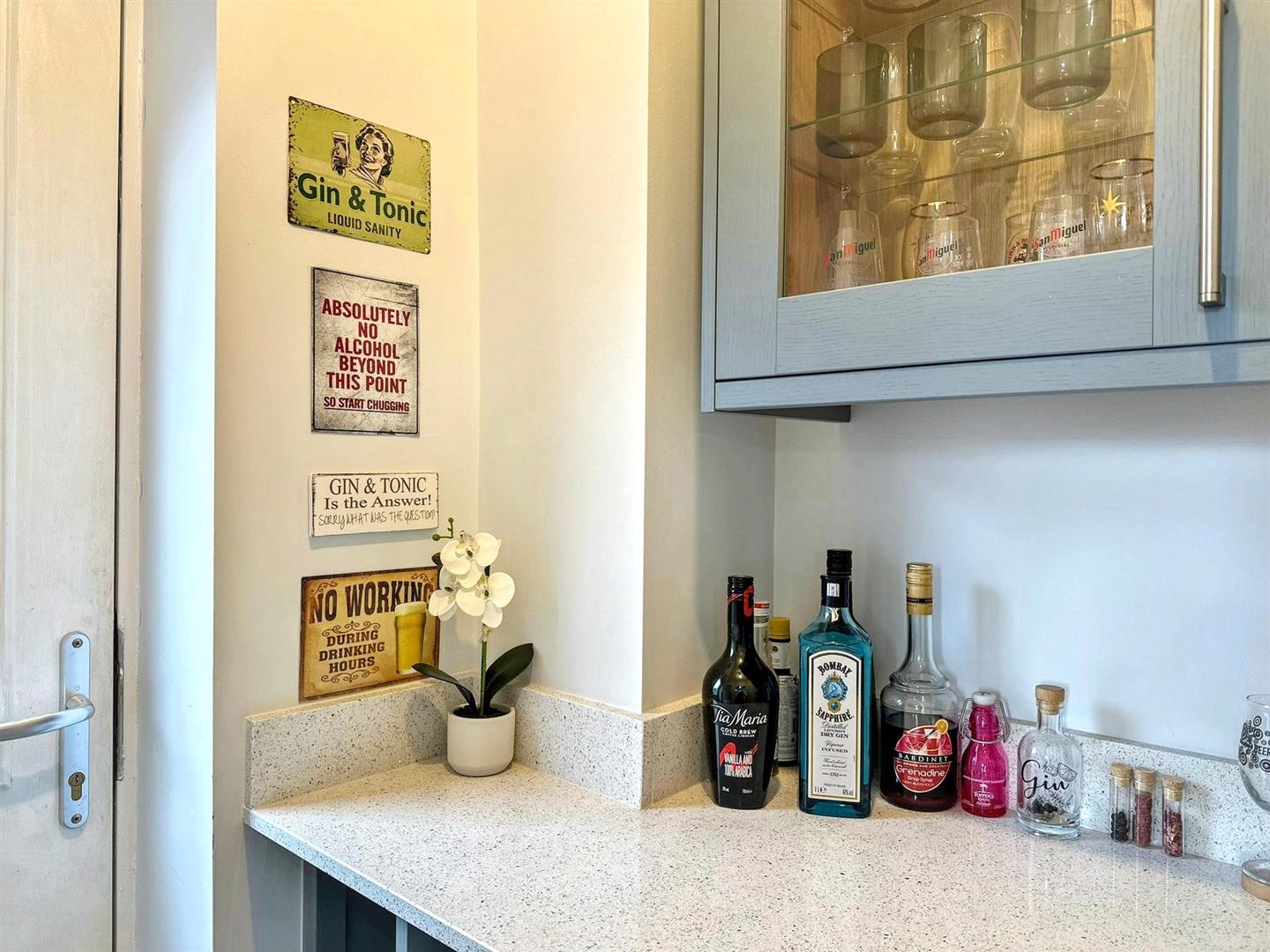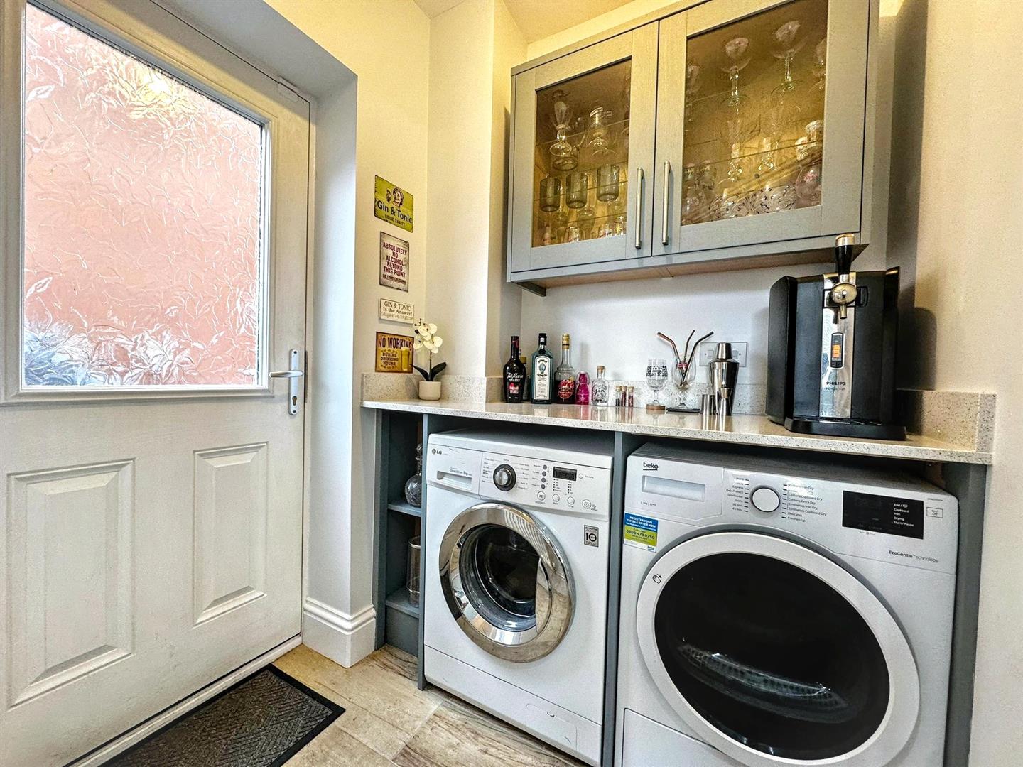Wooden design flooring. Wall mounted radiator. Fitted with a range of wall and base units with granite work tops above. Integrated bin, Lamona Wine fridge, Lamona dishwasher, electric oven, gas hob, fridge freezer, and sink unit with mixer tap above. uPVC window to the rear aspect. uPVC double doors leading to garden. Storage cupboard/Pantry. Access to Utility. Inset spotlights. Ceiling lights.