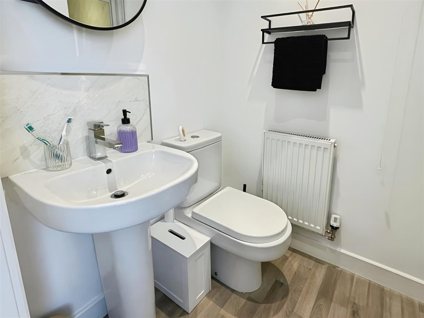 Continued wood effect laminate flooring. Low-level WC. Wall mounted wash handbasin. Bespoke panelling. Wall mounted radiator. Extractor fan. Spotlight.