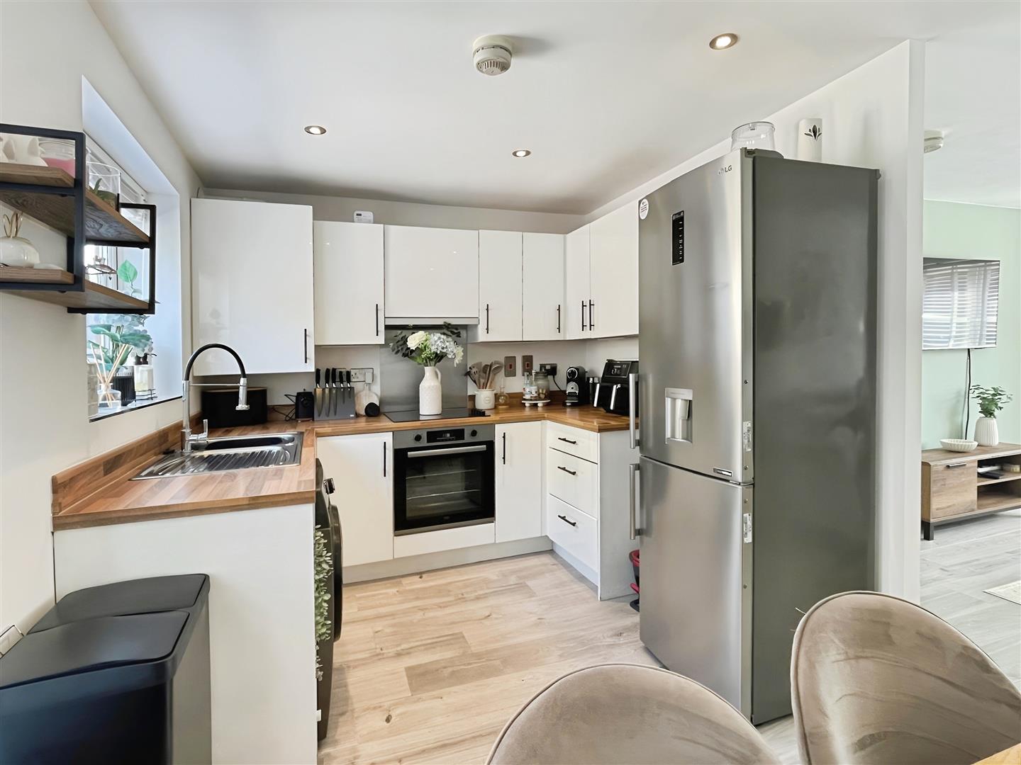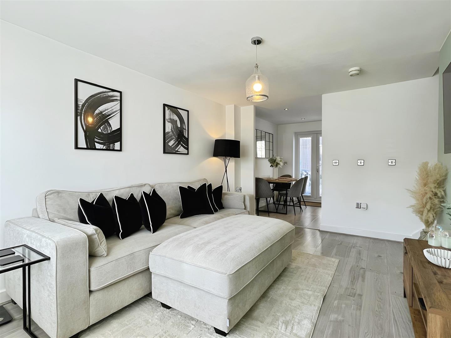 Internally, the property opens with a welcoming entrance porch leading into a bright and spacious open-plan living, kitchen, and dining area. The living space is well proportioned, featuring a large front-facing window and stairs to the first floor. The kitchen is fitted with sleek white units, offering a clean and contemporary feel, while the dining area benefits from French doors that open directly onto the enclosed rear garden, creating a seamless indoor-outdoor flow. There is also a useful downstairs WC with bespoke panelling.