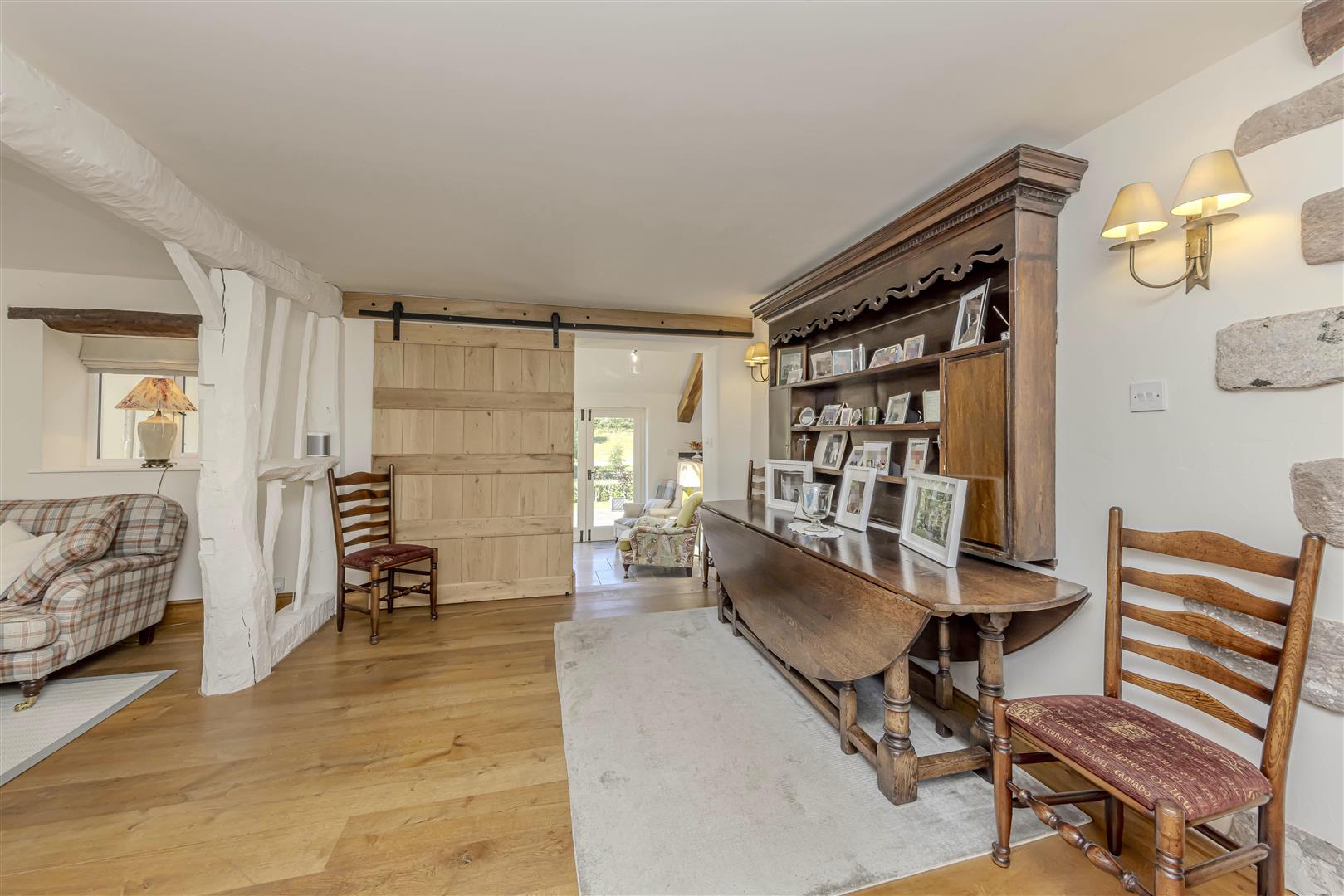The exposed oak flooring continues from the sitting room into the dining room. Windows to the front aspect, also divided by stone mullions, provide the area with natural light. Additional features include a radiator and wall lights that enhance the inviting atmosphere. The space is completed with a stable-style sliding door, providing direct access to the open plan dining kitchen, making it perfect for entertaining and family gatherings.
