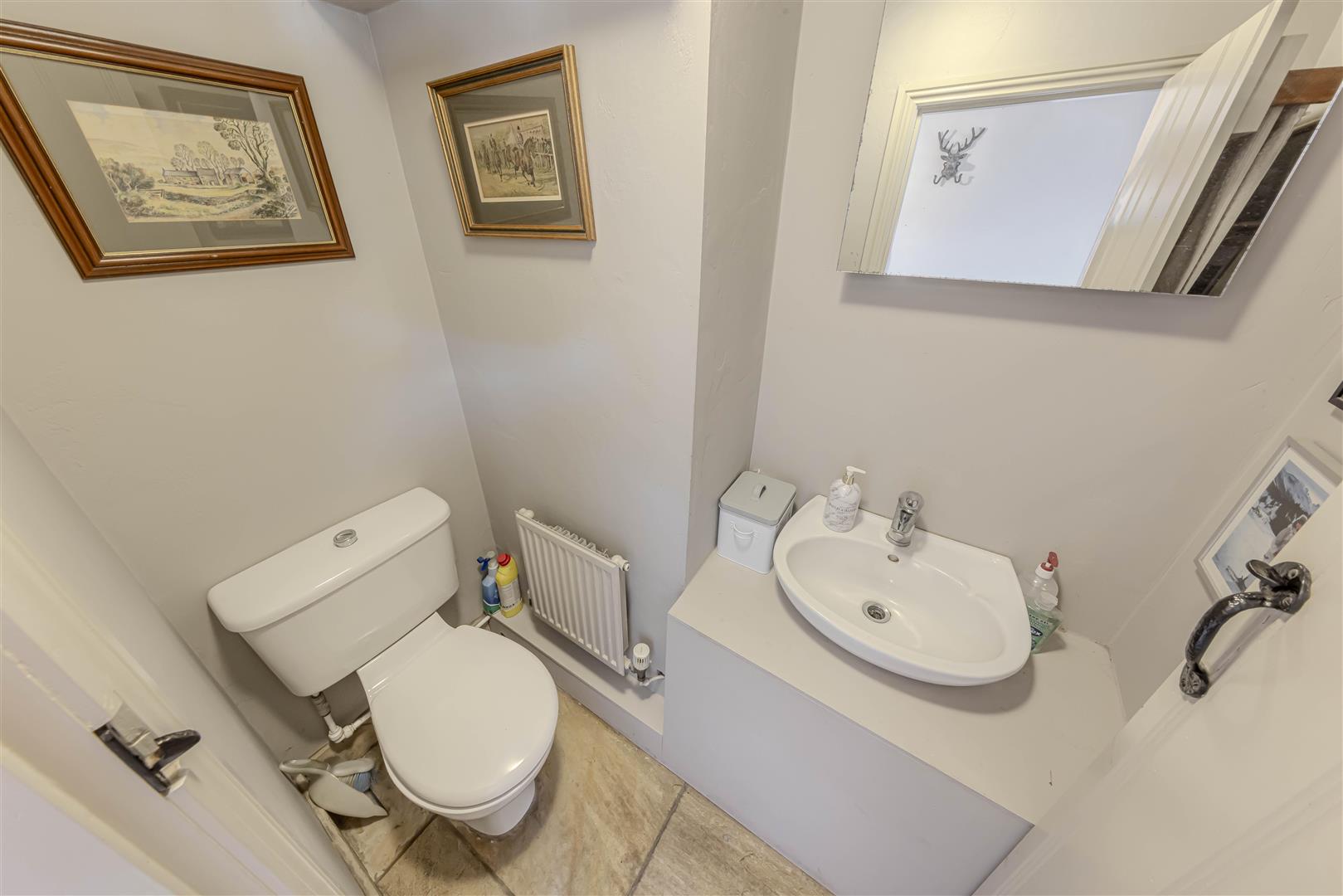 The ground floor cloakroom is practical and modern, housing a WC, radiator, wash hand basin, and ceiling light, all featuring the continuation of the stone design tiled flooring.