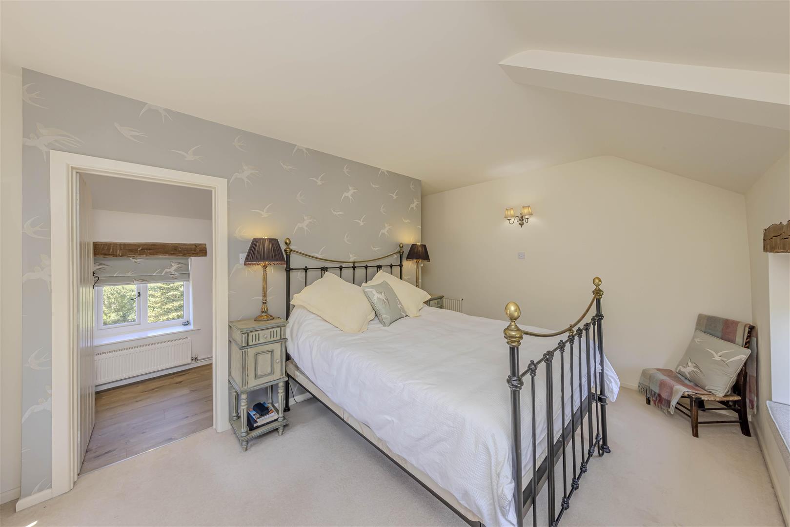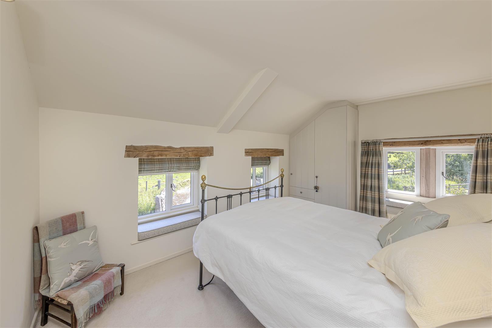 This spacious double bedroom has a fitted carpet, two windows facing the front, which not only flood the room with natural light but also the sills can be used as charming window seats. The room is enhanced by exposed beams that add character and a rustic touch. An additional side window with a stone mullion divider further complements the ambiance. For convenience, there is a fitted wardrobe with drawers and storage above, as well as a radiator to ensure a cosy environment. Access to the en-suite shower room makes this room functional for many buyers.