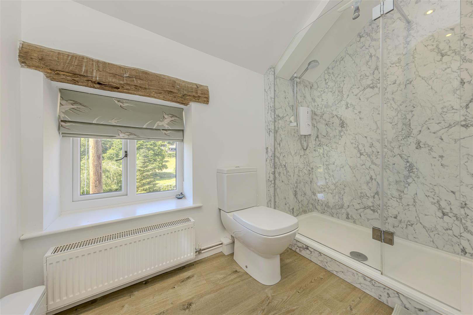 The en-suite bathroom is a modern suite, equipped with a double shower featuring glass doors for a contemporary touch. It includes a WC and a stylish vanity wash hand basin with storage underneath., The space has a radiator and exposed wooden-style flooring. A window is located to the rear aspect with an exposed beam overhead, allows for natural light. Inset spotlights provide additional illumination.