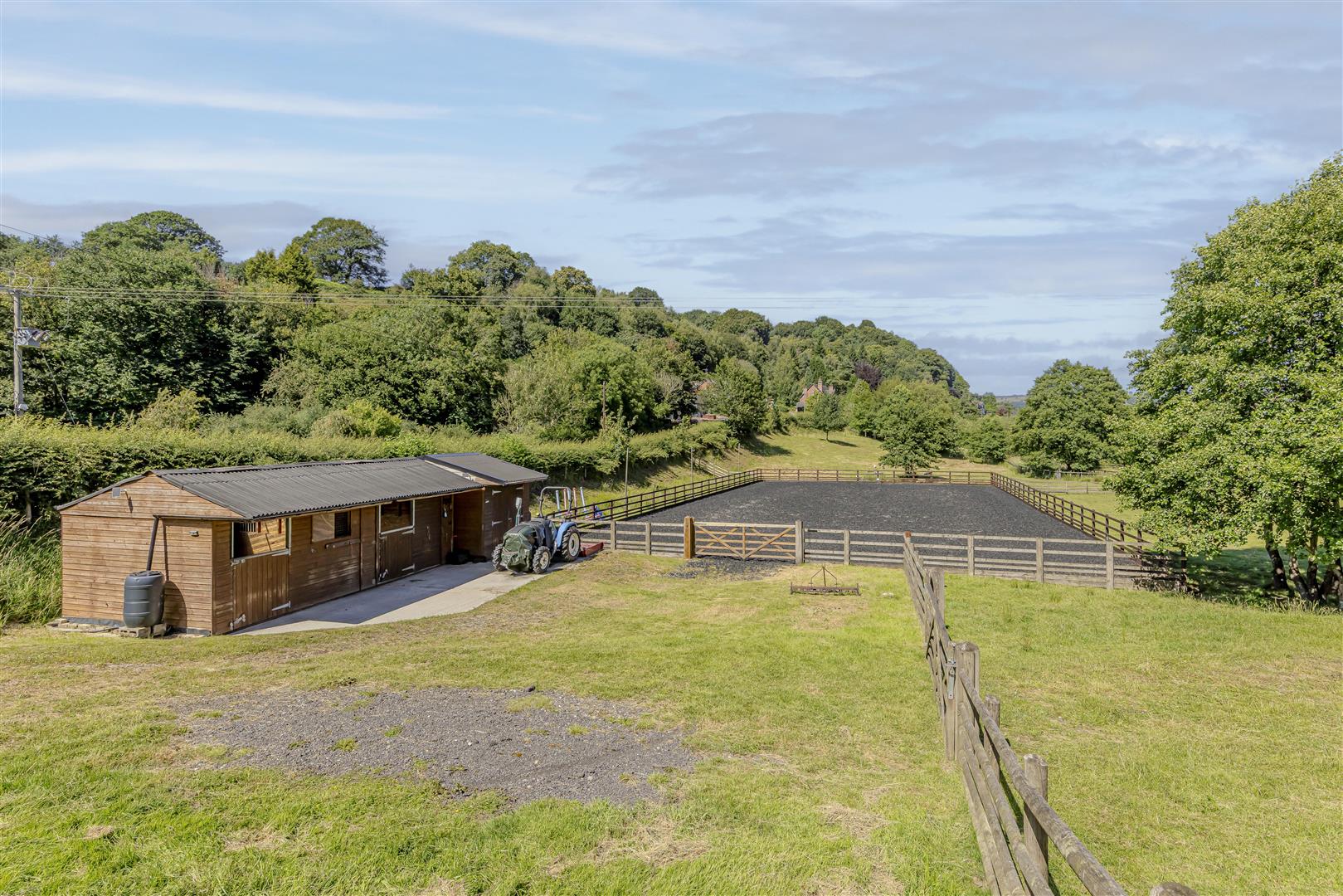 Behind the property lies additional land, split into paddock areas ideal for grazing or equestrian use. Gated access from the country road leads directly to this land, which includes two substantial stables with an adjacent tack room for storage of equipment and hay. The paddocks are designed for easy management, and the property features a purpose-built 20x20 arena that boasts adequate drainage and a well-maintained surface, suitable for various equestrian activities. There is also a field shelter.