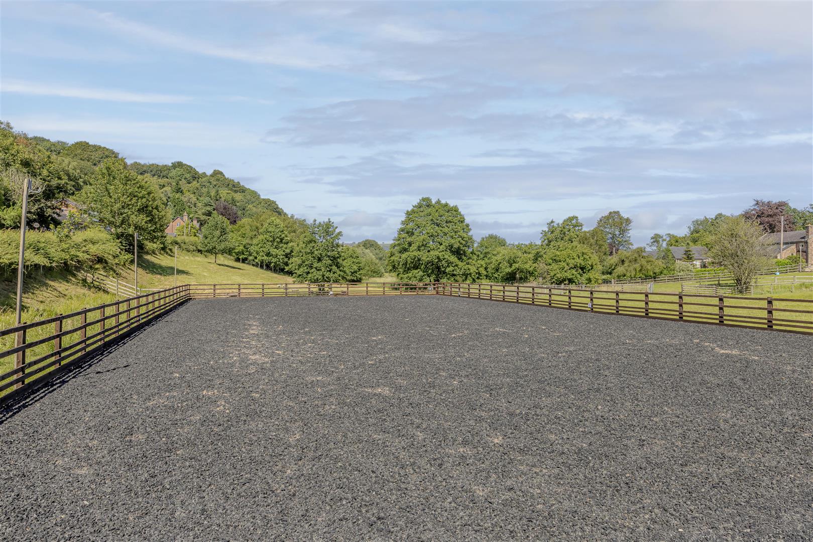 The formal gardens encompass well-maintained lawn areas, established trees, raised beds, and a variety of flowering plants and shrubs. The paddock areas facilitate easy rotation for grazing animals, complemented by a stable block with two stables and a tack/feed/storage room, leading to the well-drained 20m x 40m arena. Gated access from the country road ensures convenience for horseboxes and larger equipment.