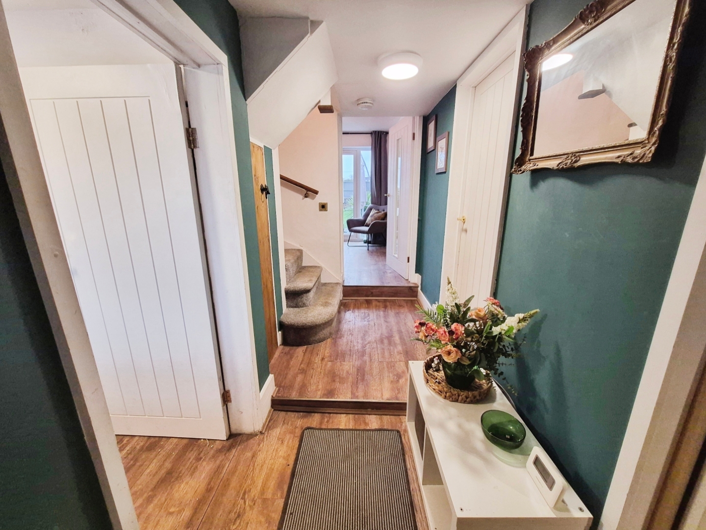 uPVC entrance door to the front aspect. Vinyl flooring. Radiator. Stairs off leading to the first floor. Under stairs storage cupboard. Ceiling light. Doors leading into: –