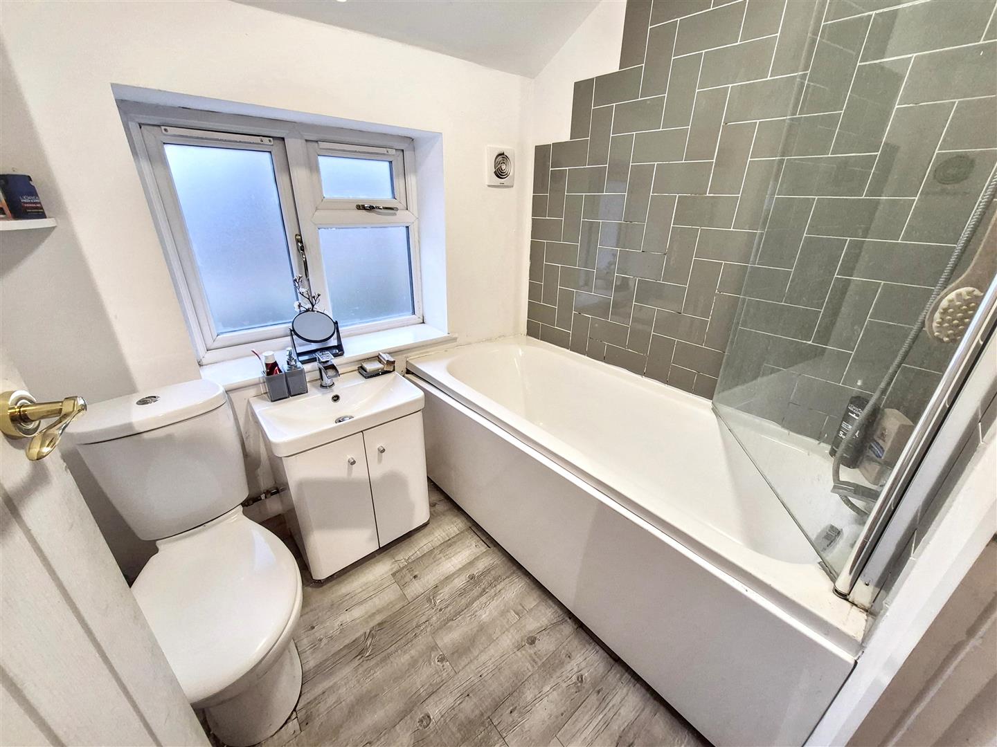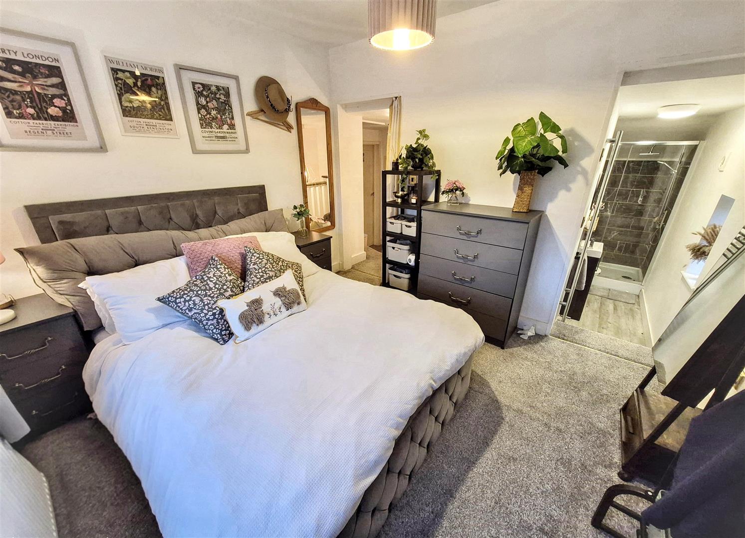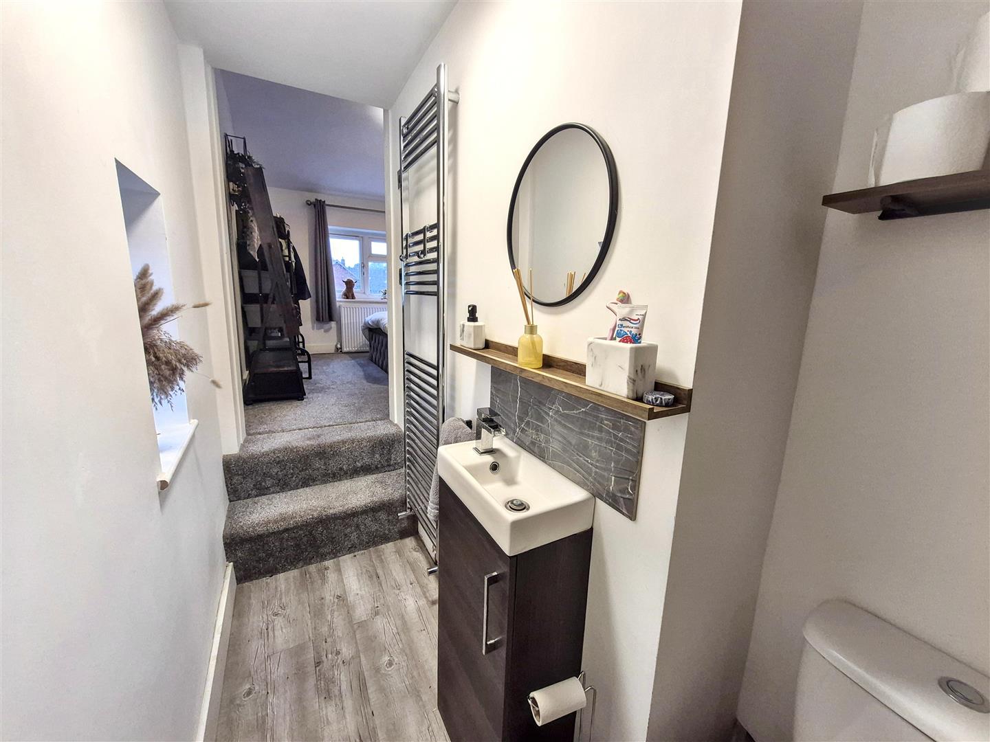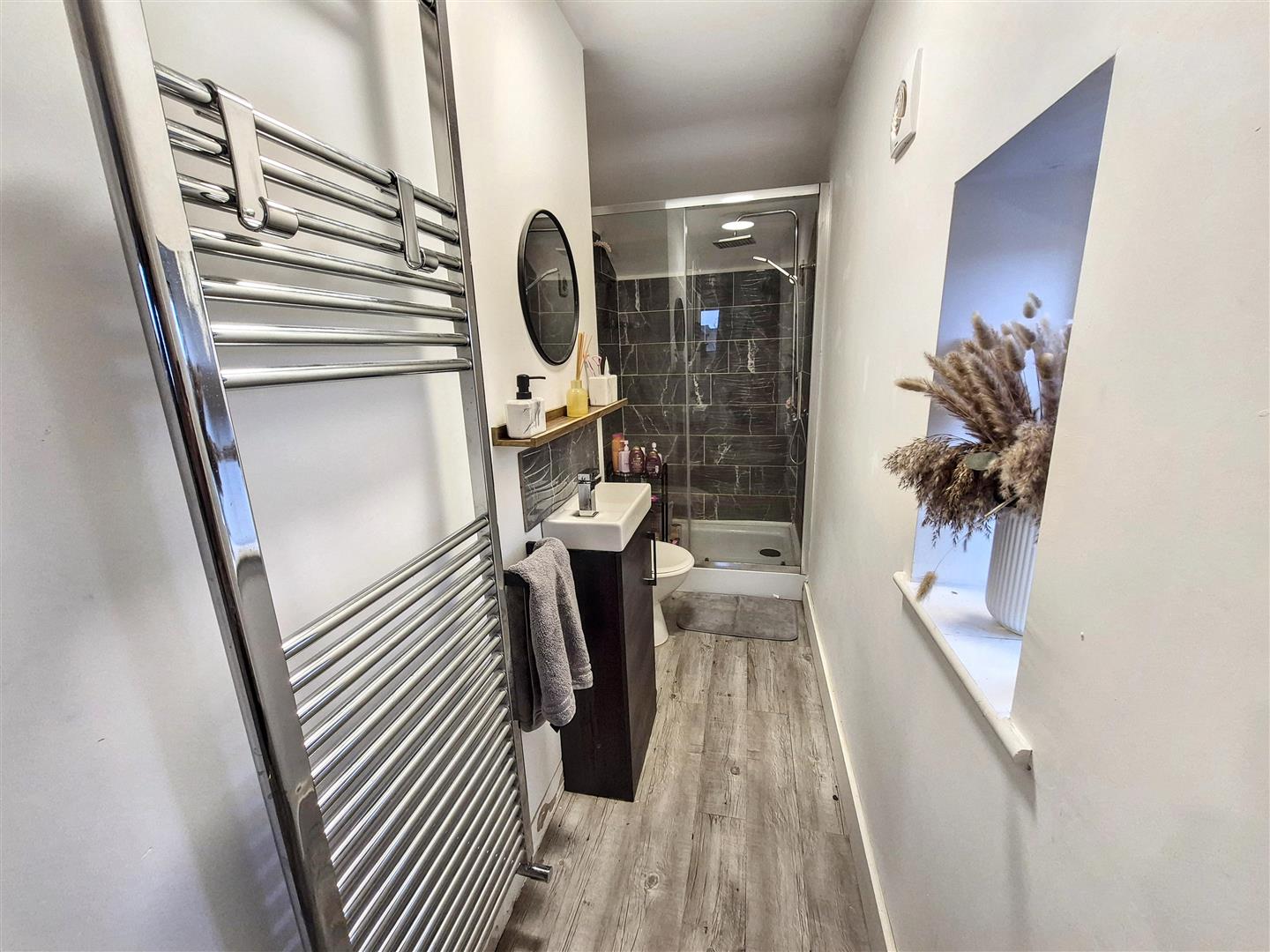 Fitted with suite comprising of shower cubicle with rainfall showerhead, low-level WC and vanity wash hand basin unit. Laminate flooring. Wall mounted heated towel rail. uPVC window to the side aspect. Ceiling light.