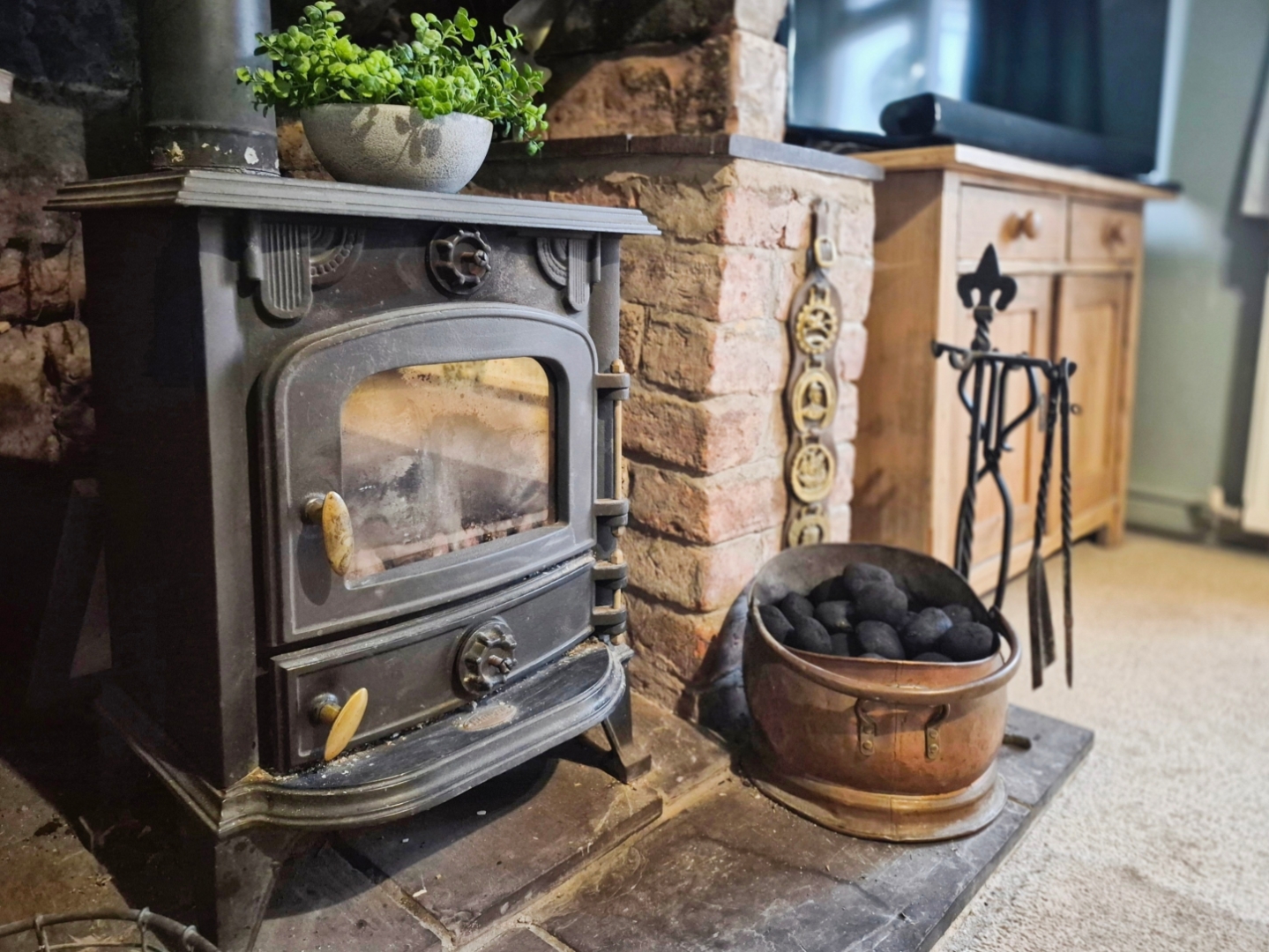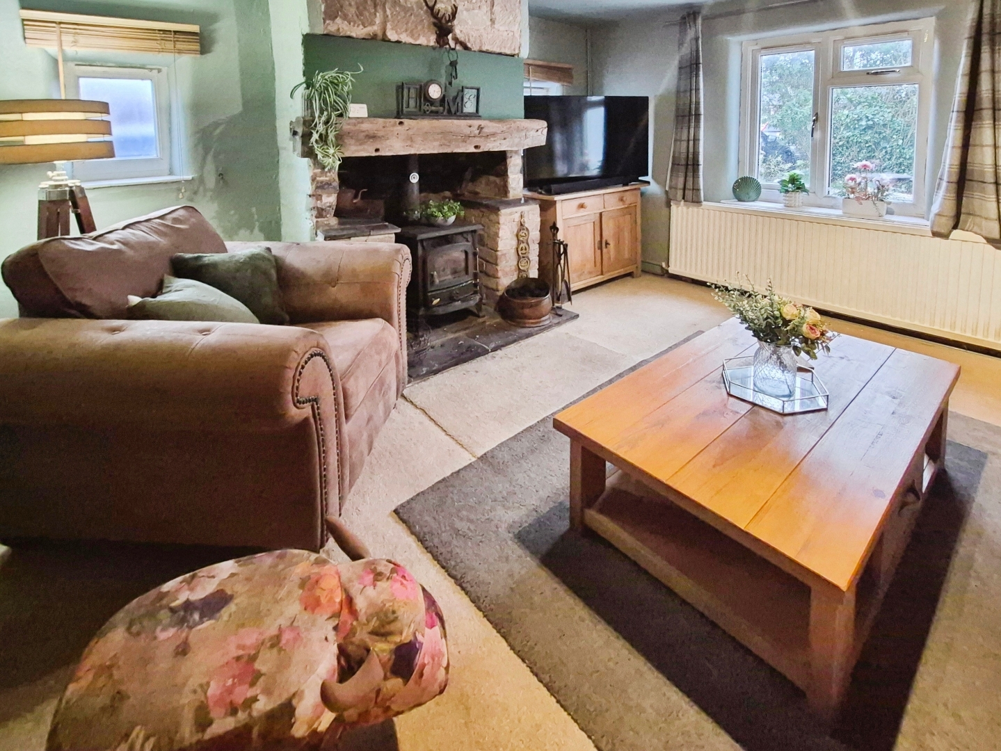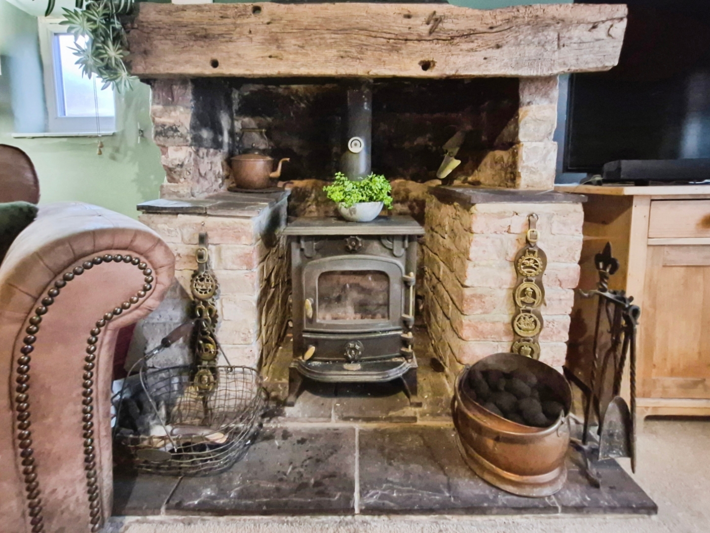 - Cosy lounge with a magnificent exposed stone fireplace and multi-fuel stove