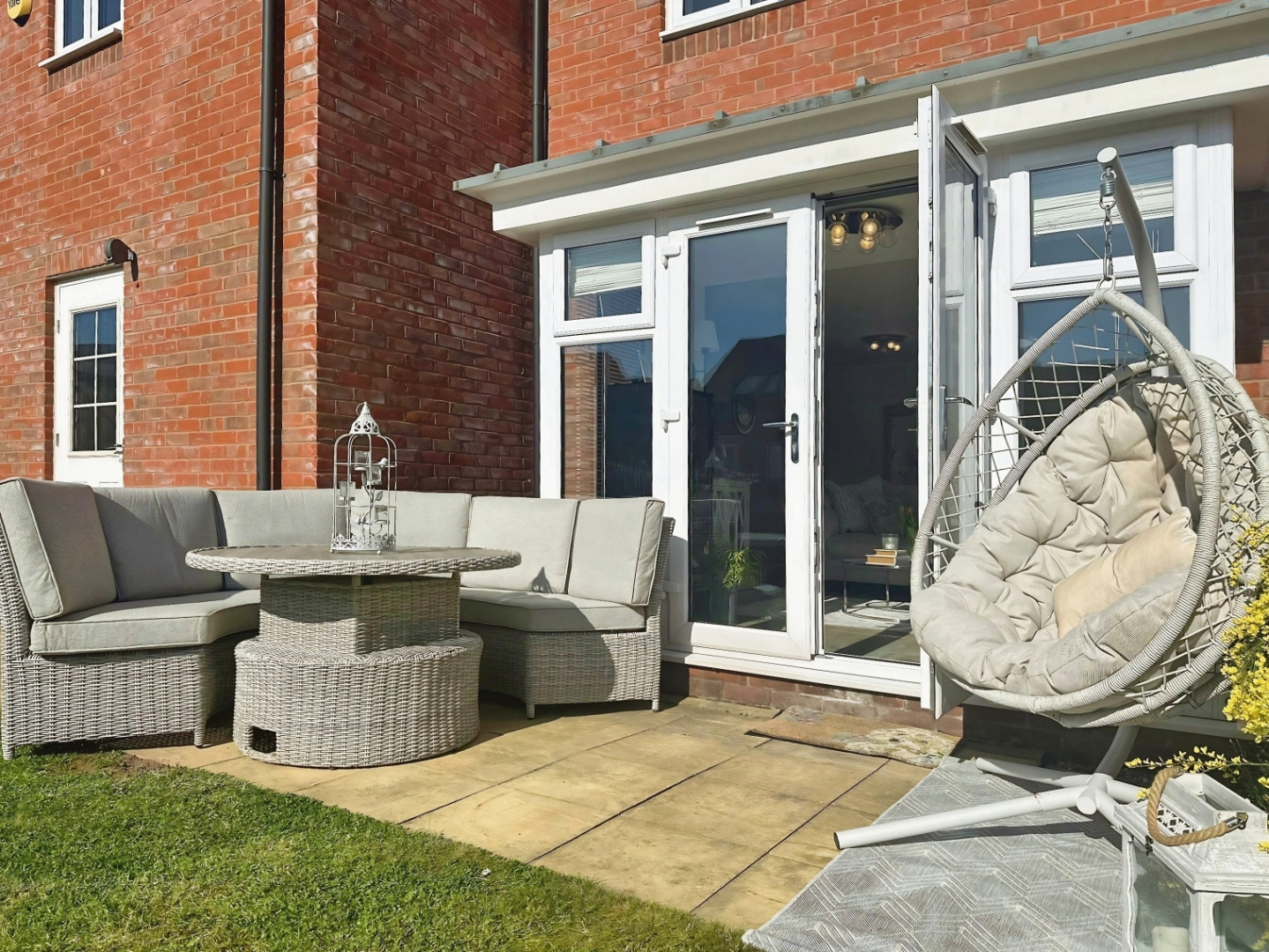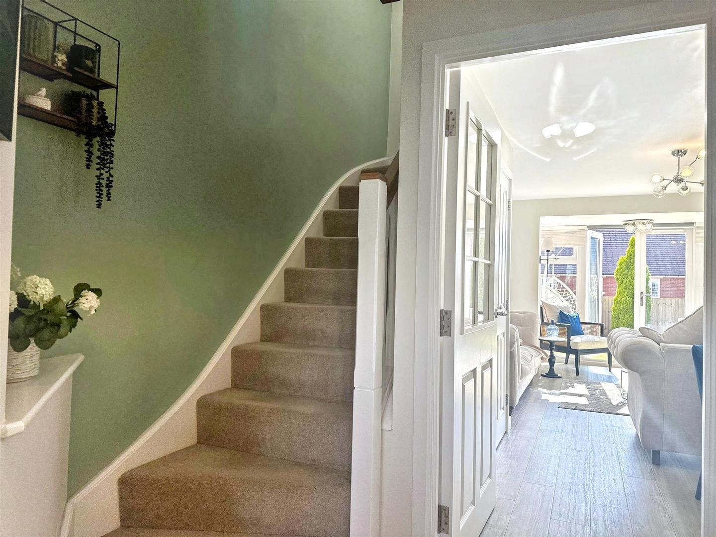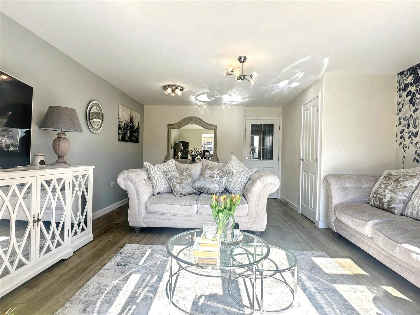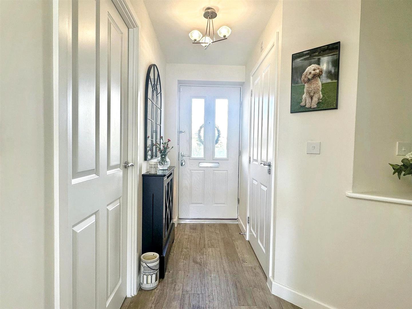 The property is approached via a driveway providing off-road parking and leading directly to the integral garage. To the front, there is a small, low-maintenance seating area positioned behind a neatly maintained hedge, offering a bit of separation from the road. The setting is straightforward and practical, with easy access for parking and day-to-day use.
