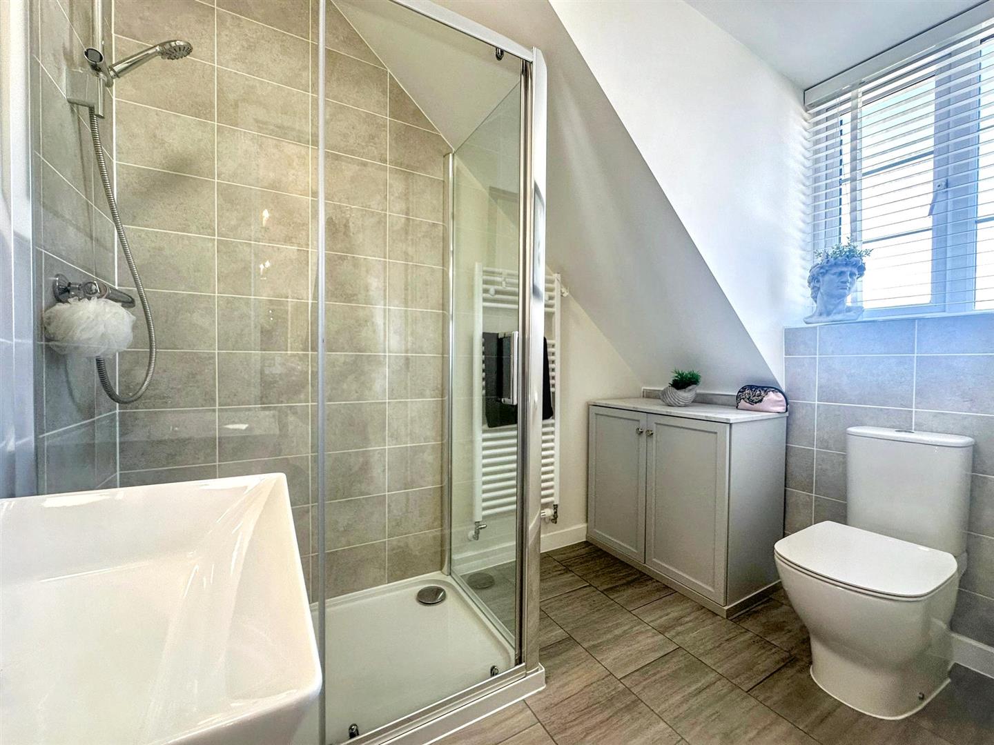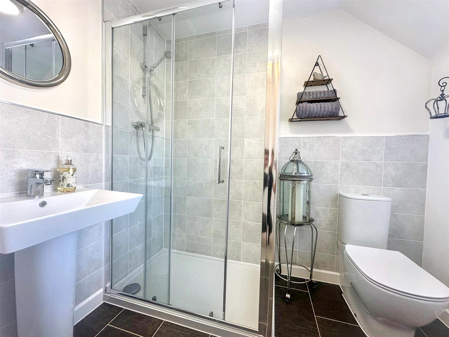 Fitted with a suite comprising of, shower cubicle, low level wc and pedestal wash hand basin. Laminate flooring. uPVC window to the front aspect. Inset spotlights.