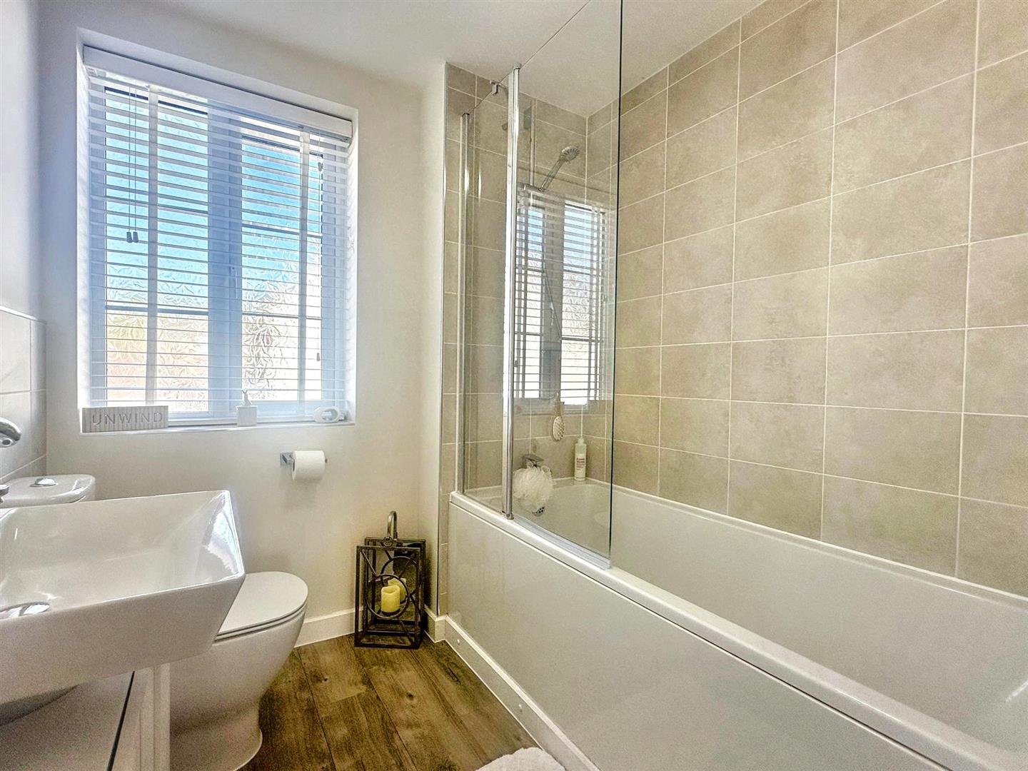 Fitted with a suite comprising of, bath with shower attachment, low level WC, pedestal wash hand basin. Laminate flooring. Heated towel rail. uPVC window to the front aspect. Ceiling light.