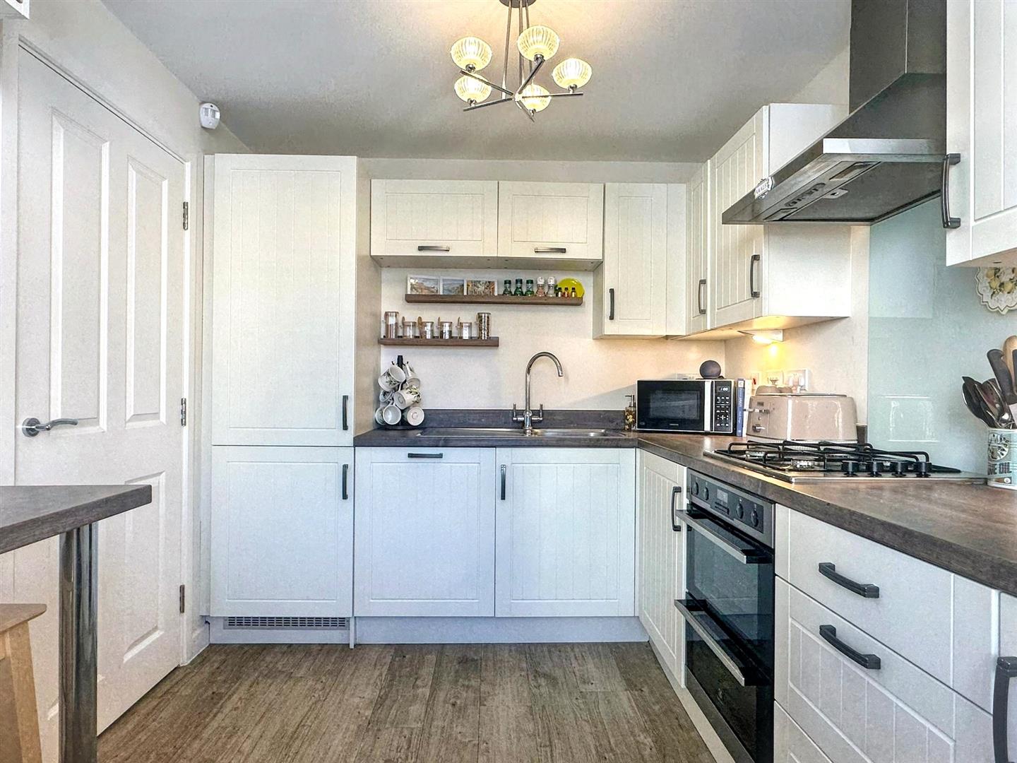Fitted with a range of wall and base units with work surfaces over incorporating a stainless steel drainer sink unit, integrated dishwasher, fridge freezer, double oven, gas hob with extractor fan over. Laminate flooring. Radiator. uPVC Bay window to the front aspect. Cupboard housing combination boiler. Ceiling light.