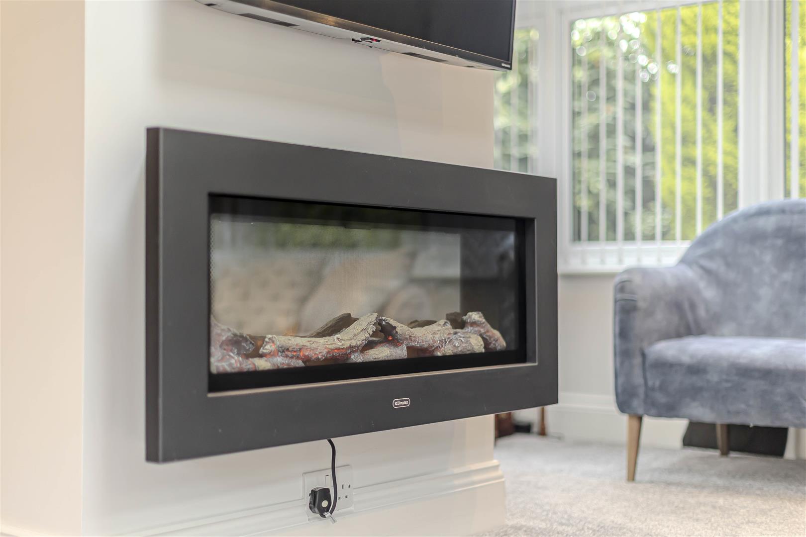 Carpet. Two wall mounted upright radiators. Wall mounted electric log burning effect fire. uPVC windows to the front side and rear aspects. Two Velux windows to the ceiling. Two uPVC doors leading to the garden. Ceiling spotlights.