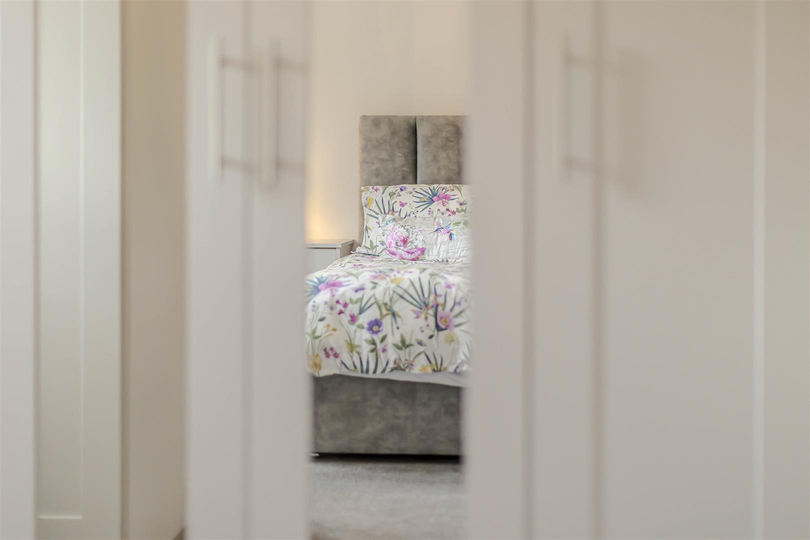 Fitted with a suite comprising of a walk-in shower with drencher showerhead, wall mounted vanity wash hand basin unit and wall hung WC. Vinyl flooring. Fully tiled Walls. Wall mounted heated towel rail. Obscured uPVC window to the front aspect. Ceiling spotlights.
