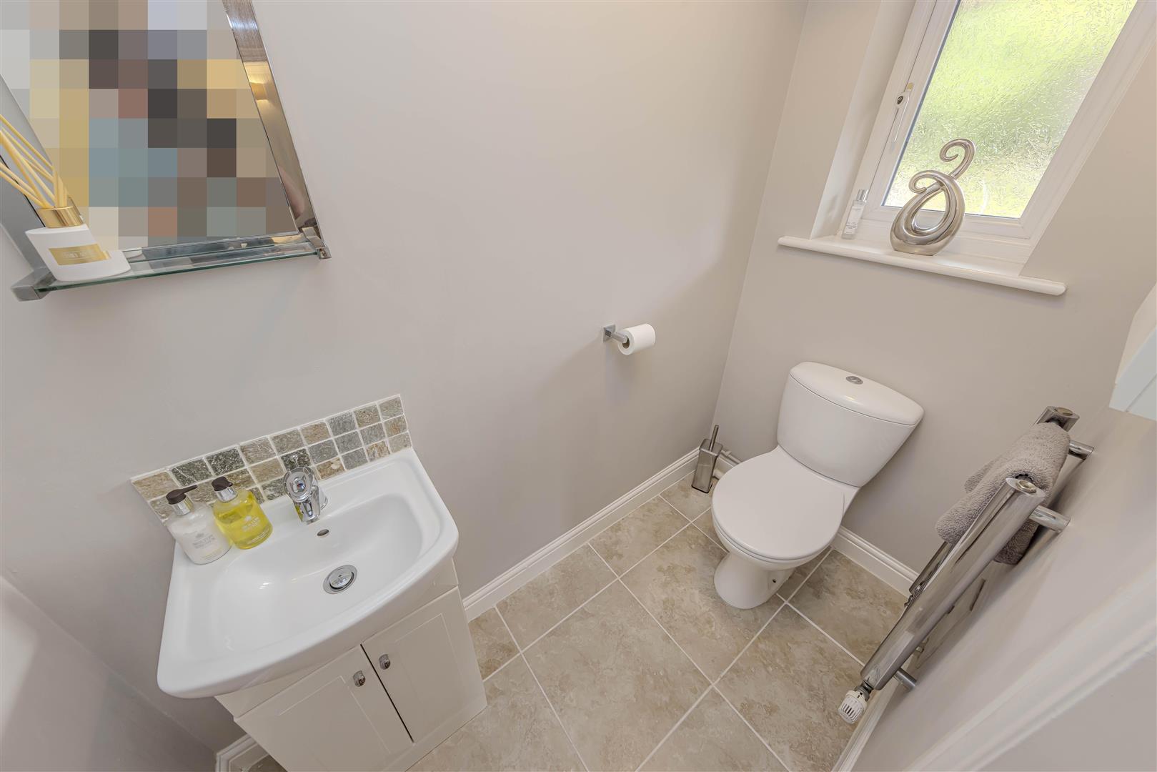 Fitted with a low-level WC and vanity wash hand basin unit. Tiled flooring. Wall mounted heated towel rail. Obscured uPVC window to the front aspect. Ceiling light.