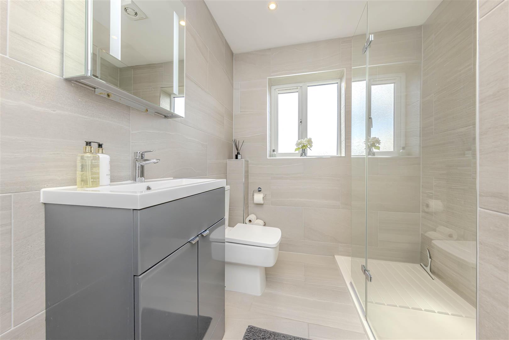 Fitted with a suite comprising of walk-in shower with drencher showerhead, low-level WC and vanity wash hand basin unit. Tiled flooring. Fully tiled walls. Obscured uPVC window to the side aspect. Wall mounted heated towel rail. Ceiling spotlights. Airing cupboard off housing the hot water cylinder.