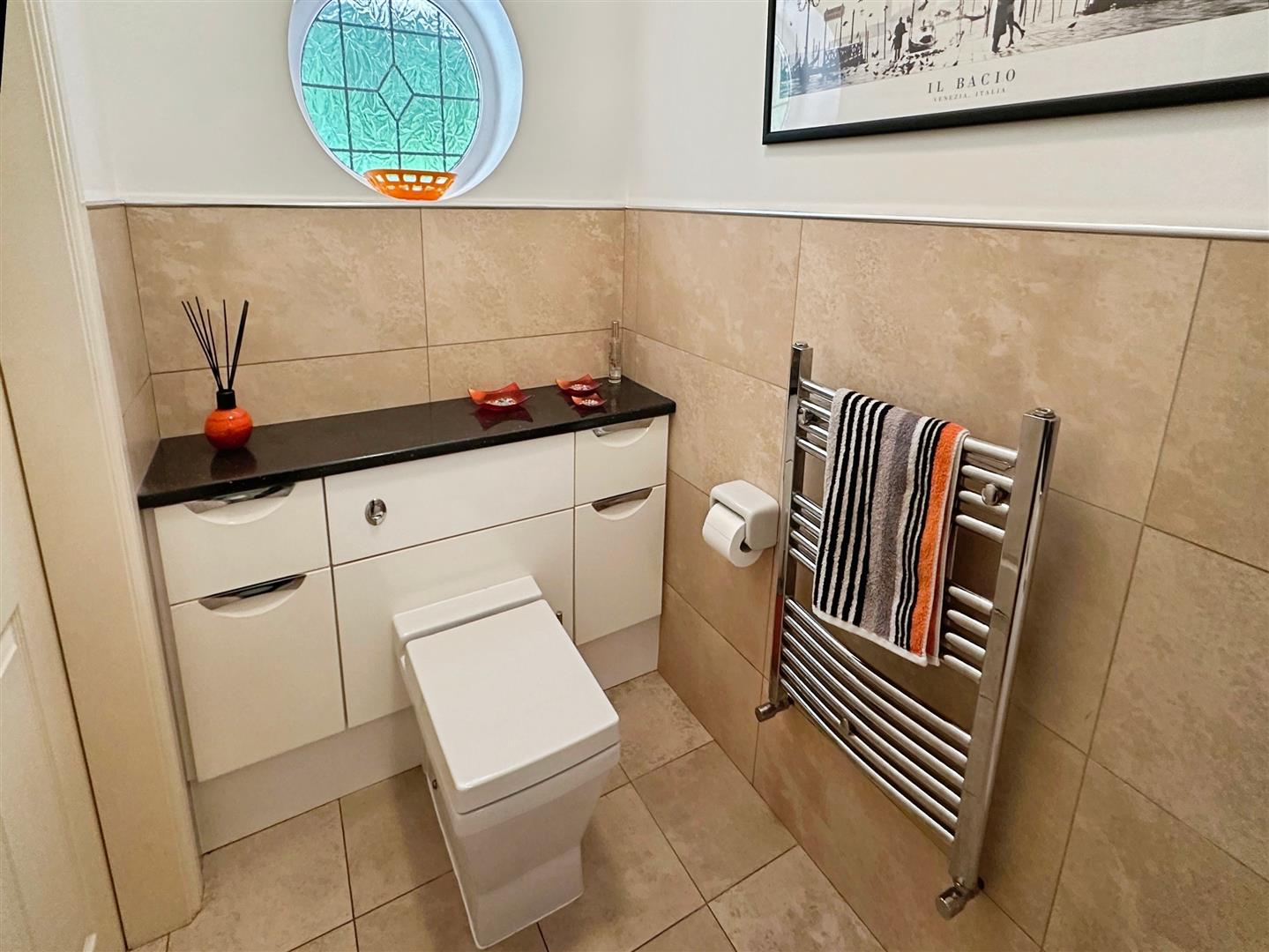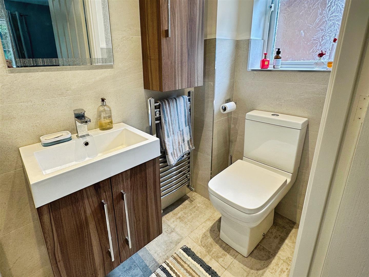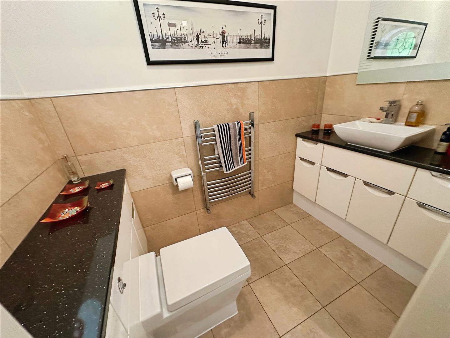 Fitted with vanity units housing a countertop wash hand basin with mixer tap and in low-level WC. Tiled flooring. Part tiled walls. Wall mounted heated towel rail. Obscured uPVC window to the front aspect. Ceiling light.