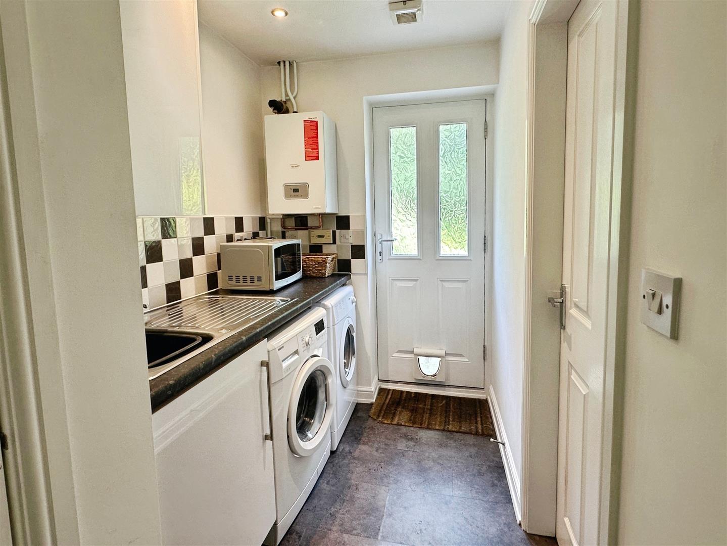 Fitted with a wall and base unit with worksurface over incorporating a stainless steel sink and drainer unit with mixer tap. Plumbing automatic washing machine and space for condensing tumble dryer. Wall mounted Glowworm central heating boiler. Storage cupboard off. Karndean flooring. Radiator. Ceiling spotlights. Composite door leading to the rear garden. Internal door leading to the garage.