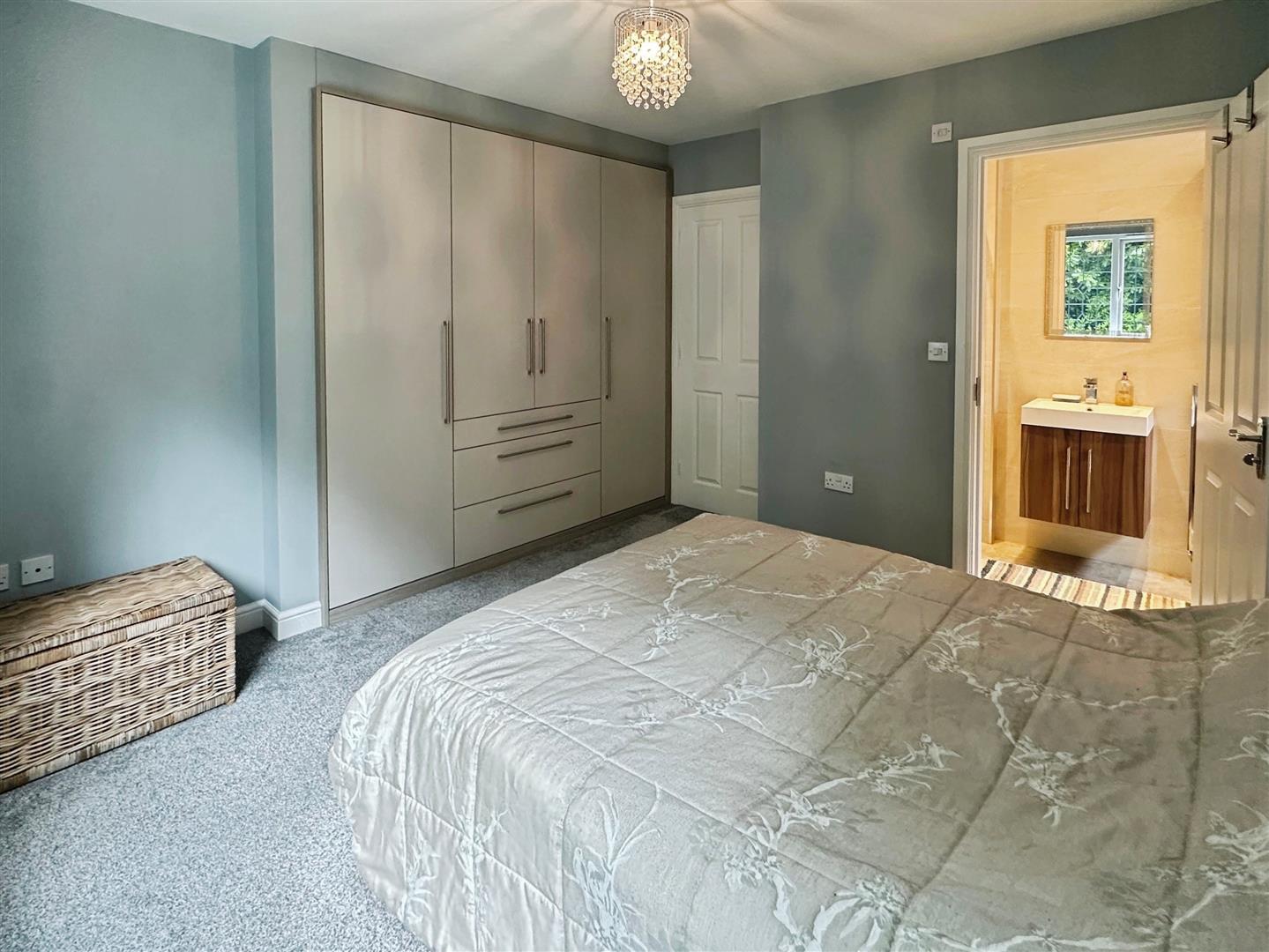 Carpet. Fitted with a range of bedroom furniture, including wardrobes, drawers and bedside cabinets. Radiator. uPVC window to the front aspect. Ceiling light. Door leading into: –