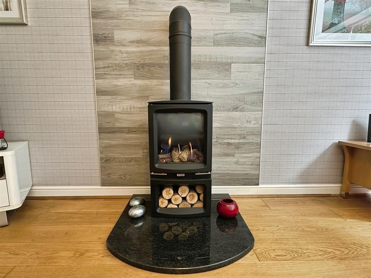 Engineered oak flooring. Radiator. uPVC window to the front aspect. Feature log burning effect gas stove set on a granite hearth with a tiled background. Coving to the ceiling. The ceiling light. Double doors leading into:–