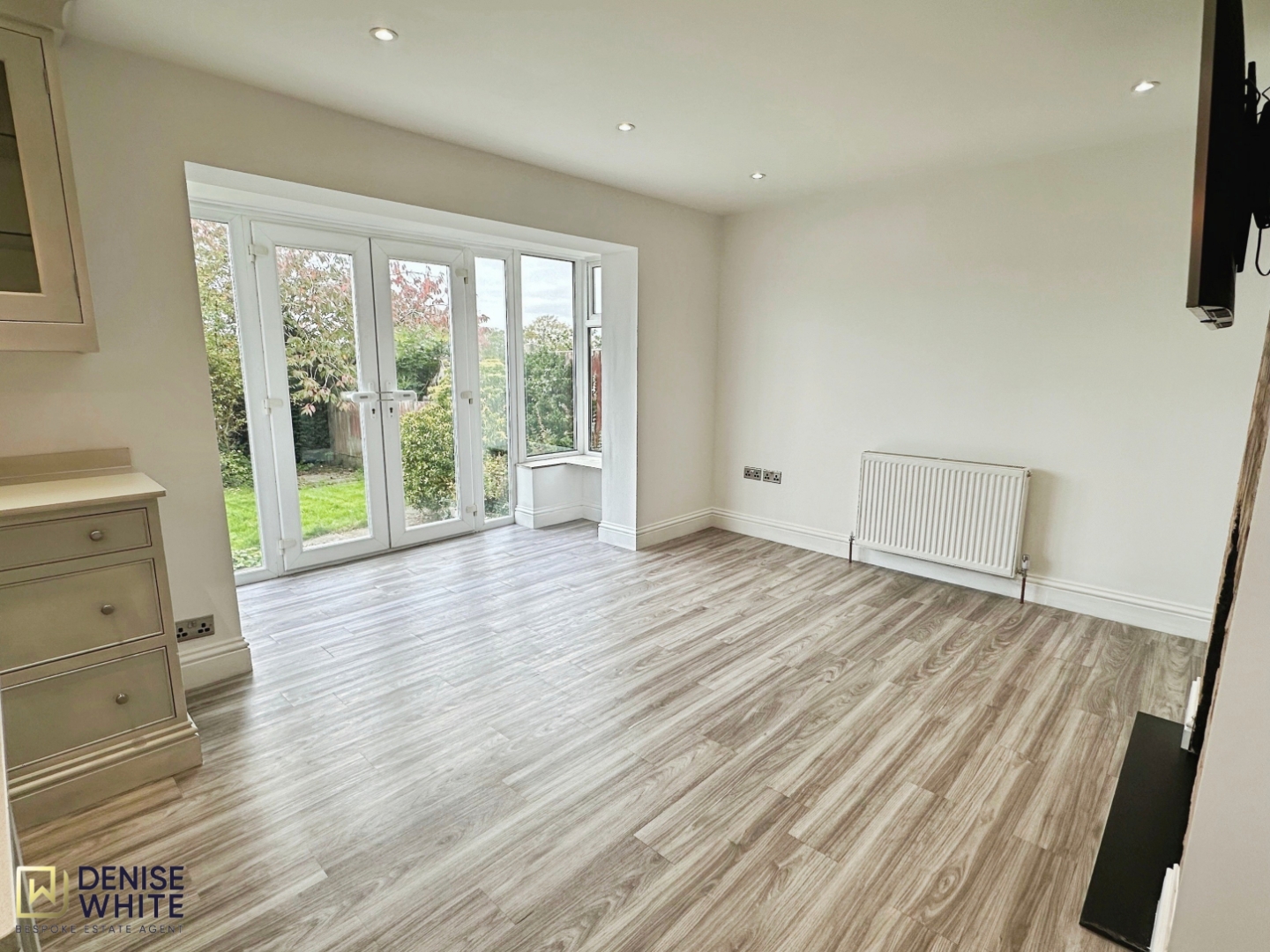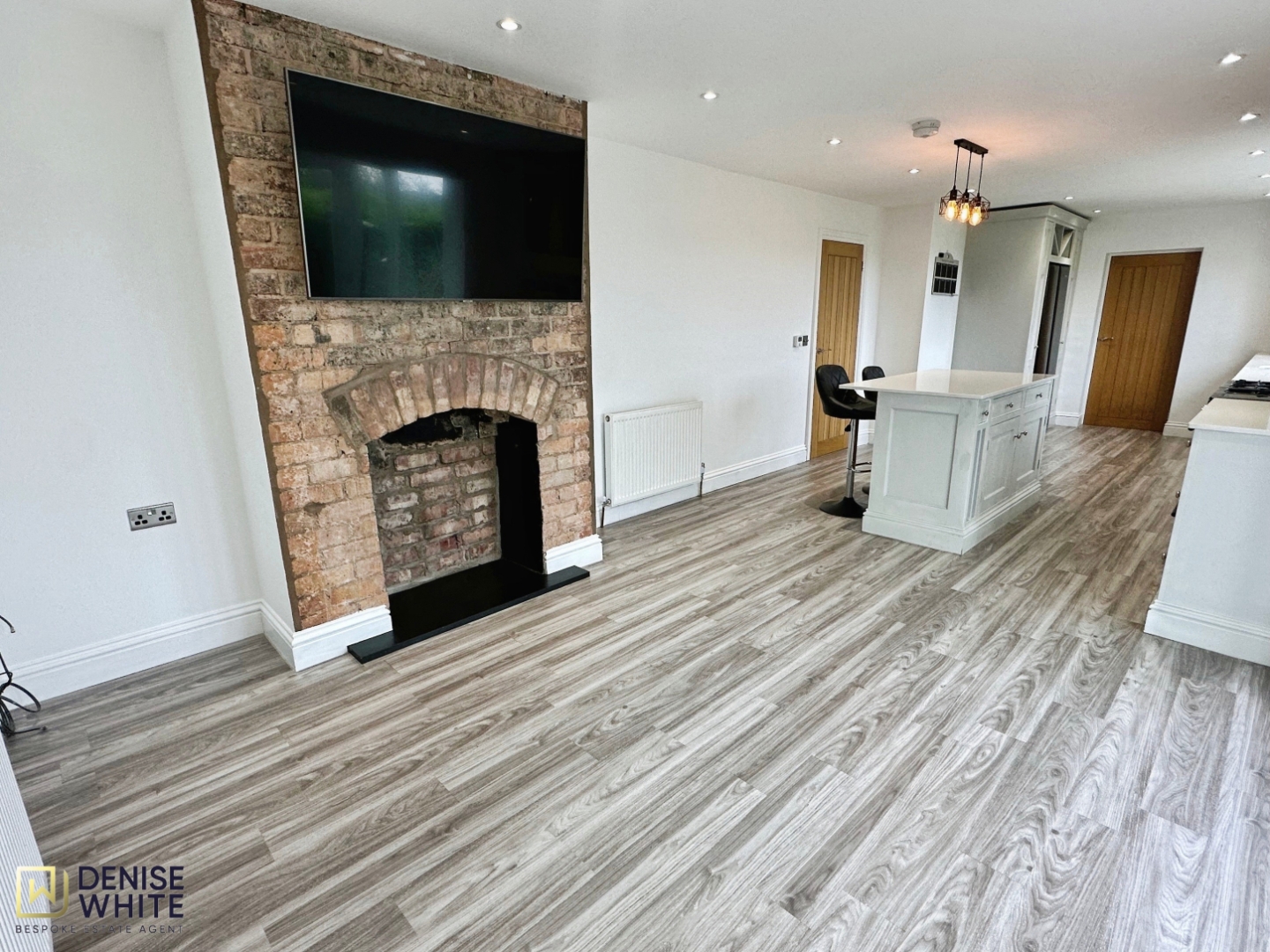 Fitted with a range of wall and base units with Quartz work surfaces over incorporating an inset one and a half bowl stainless steel sink unit with hose mixer tap. Space for range style cooker with extractor hood over. Space for an dishwasher and American style fridge freezer. Centre Island with breakfast bar. Laminate flooring. Two radiators. uPVC window to the rear aspect. UPVC French doors leading to the rear garden. Feature exposed brick fireplace. Ceiling light and spotlights. Door leading into: –