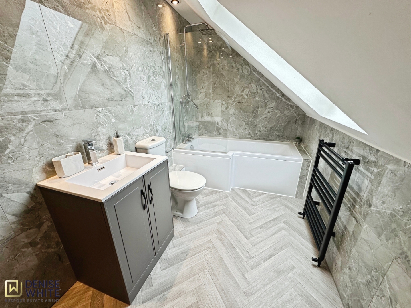 Fitted with a suite comprising of 'P' shaped bath with rainfall shower over, low-level WC and vanity wash hand basin unit. Vinyl flooring. Fully tiled walls. Velux window to the front aspect. Ceiling spotlights. Wall mounted heated towel rail.