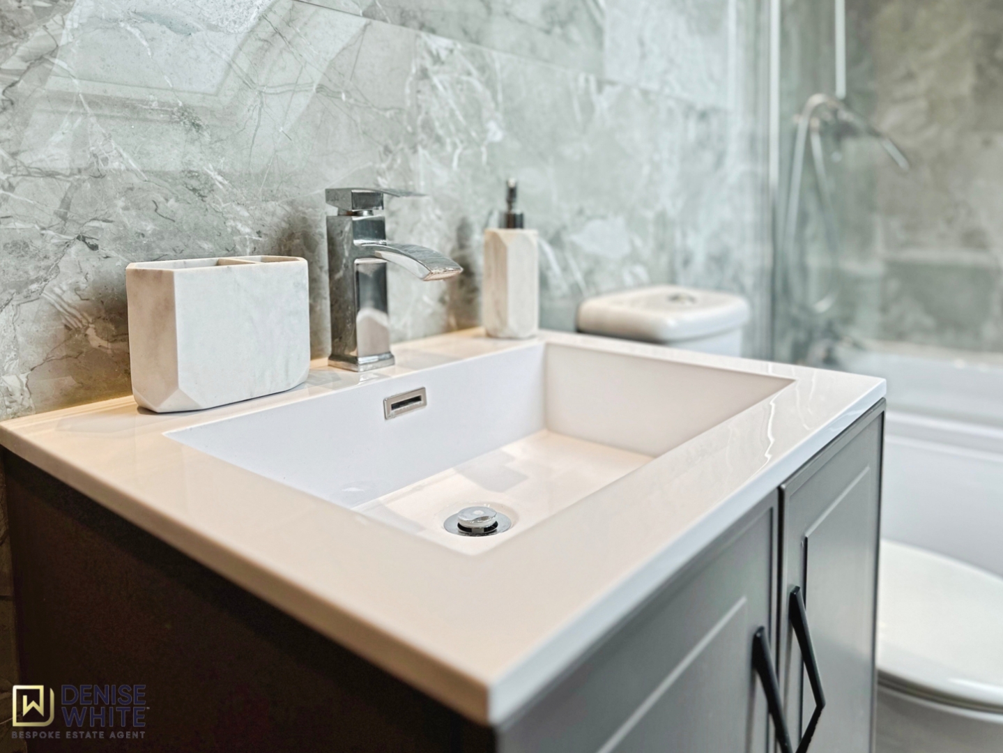 Fitted with a low-level WC and vanity wash hand basin unit. Laminate flooring. Wall mounted heated towel rail. Obscured uPVC window to the rear aspect. Ceiling spotlight.