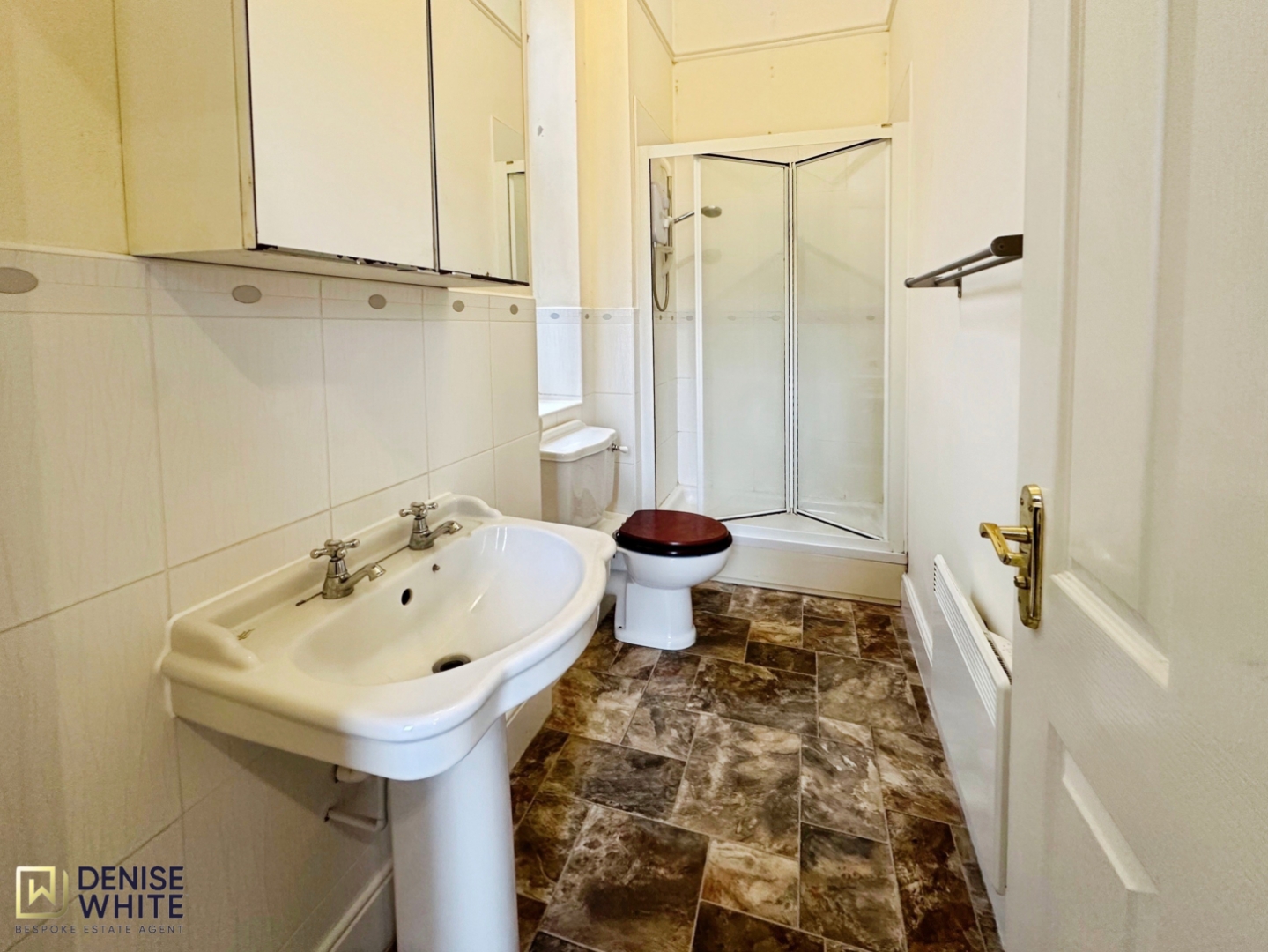 Fitted with a suite comprising of shower cubicle with electric shower, low-level WC and pedestal wash hand basin. Vinyl flooring. Part tiled walls. Wall mounted electric heater. Obscured sealed unit double glazed sash window to the side aspect. Ceiling light.