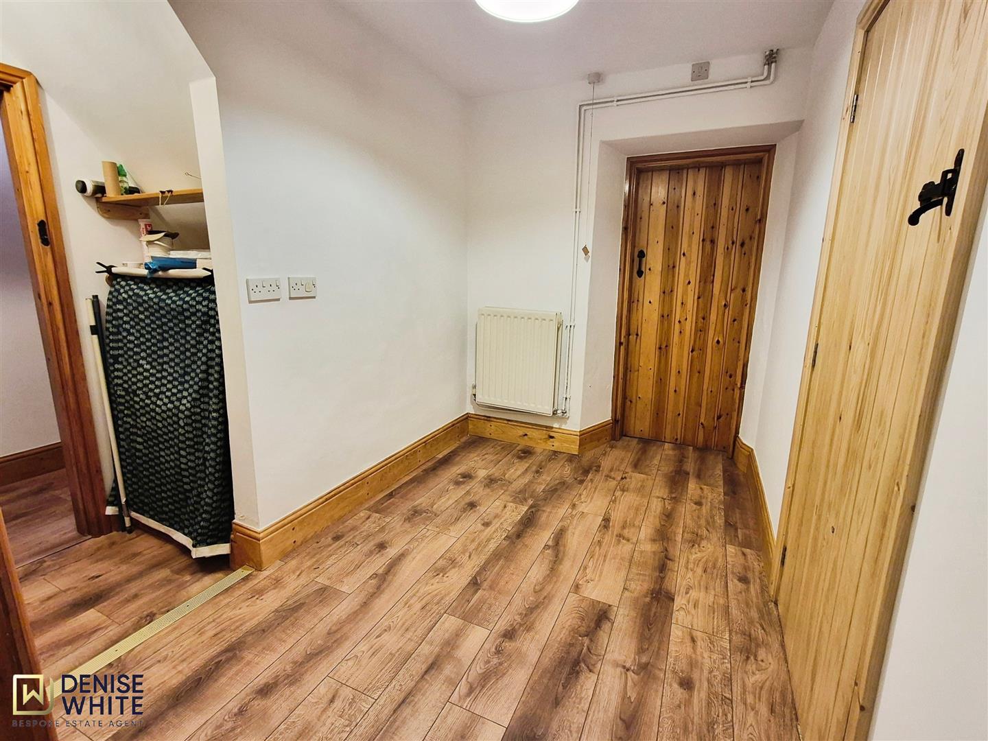 Fitted with a pedestal wash hand basin, W.C. Quarry tiled flooring. Ample space for white goods, fitted shower cubicle, heated tower rail, tiling to walls, two ceiling lights, two windows to the rear aspect.
