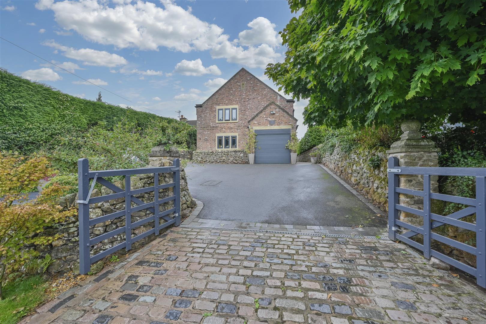 The property is approached via a charming cobbled-style entrance with double gates and stone pillars, the driveway provides ample parking and leads to a single garage with an electric door. The property is surrounded by feature dry stone walls and hedging, enhancing its countryside appeal.