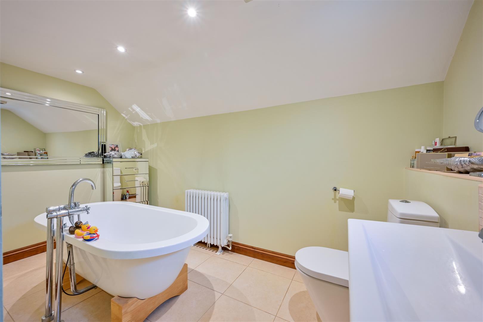 The ensuite bathroom includes a freestanding bath with a central tap and shower attachment, a WC, a wash hand basin, a heritage style radiator, inset spotlighting, and a tiled floor.