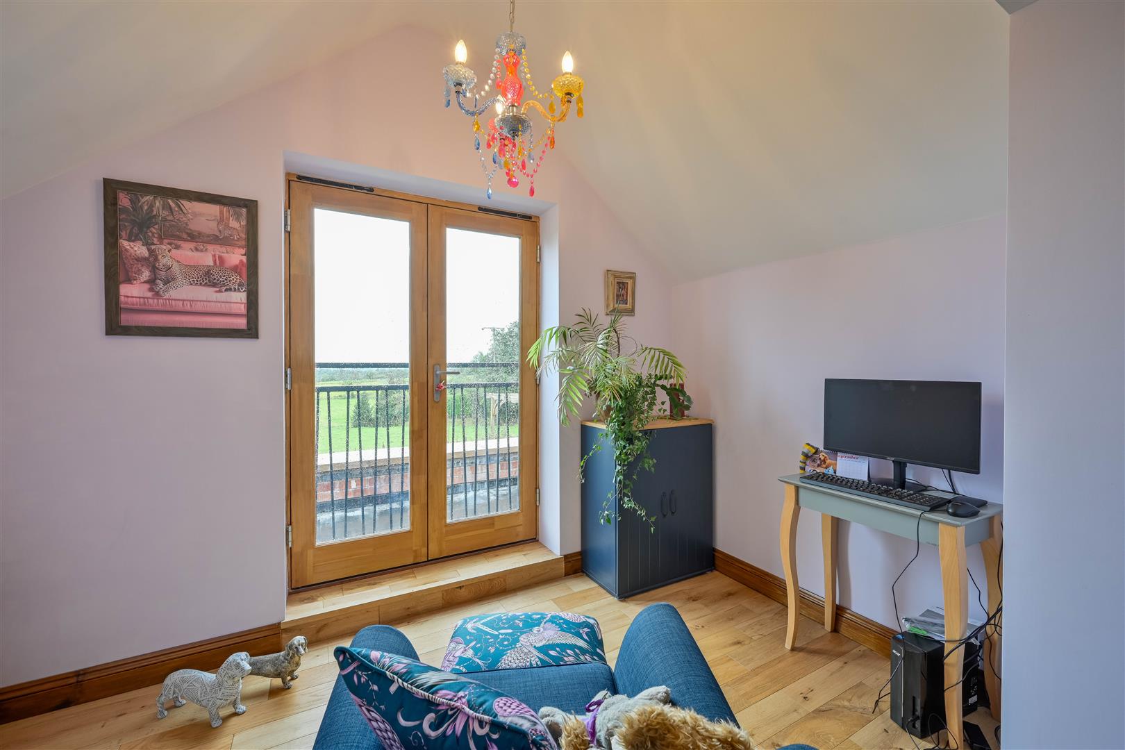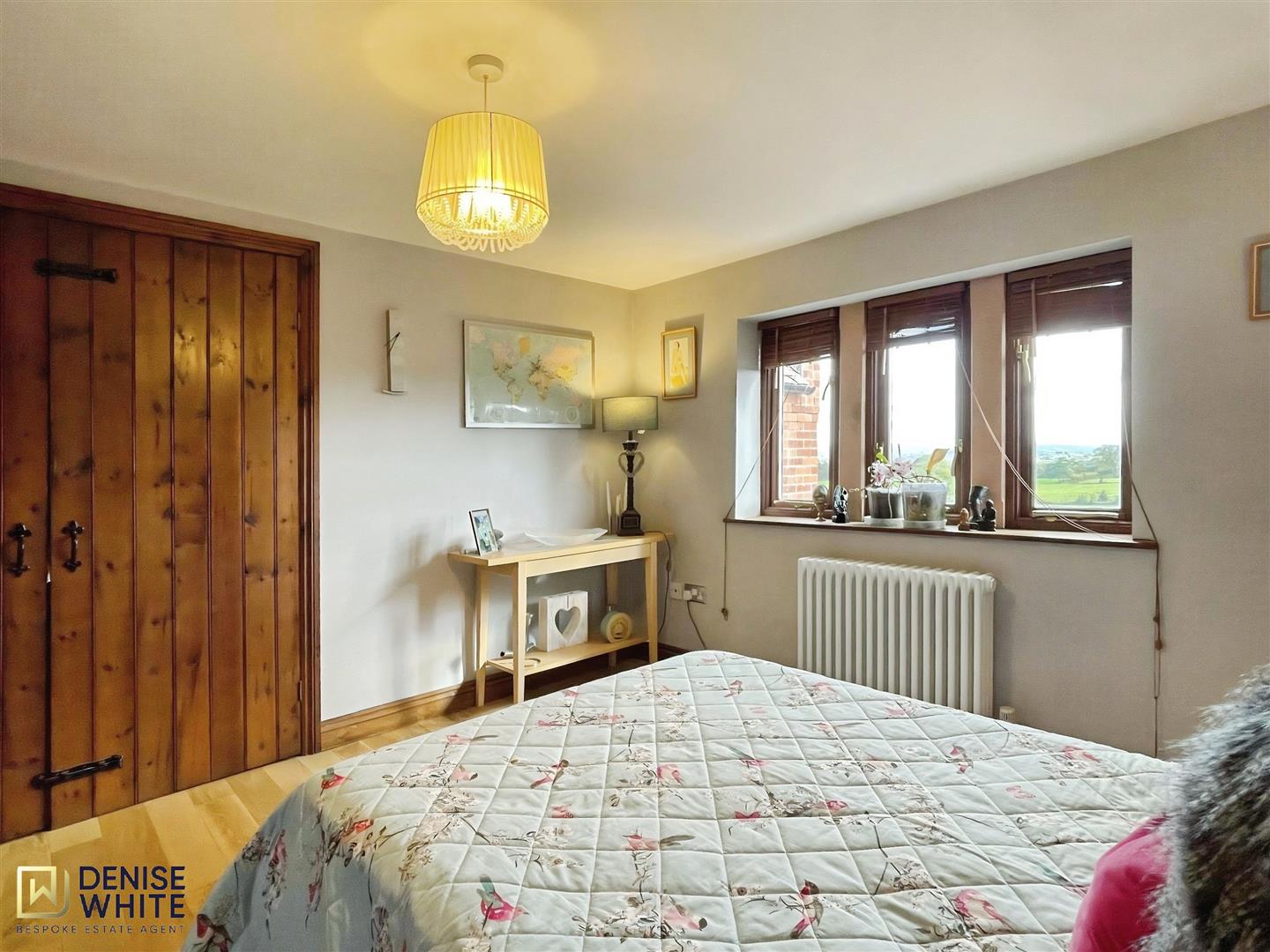 Bedroom two is a spacious double room with an additional area that could be utilised for various purposes, including a reading area, office space, or dressing room. The main bedroom has good-sized fitted wardrobes and exposed wooden flooring throughout the area, with two ceiling lights. The reading area boasts a vaulted ceiling and double doors leading out to a Juliet style balcony, which overlooks the rear garden and fields, offering delightful views over the Staffordshire Moorlands.