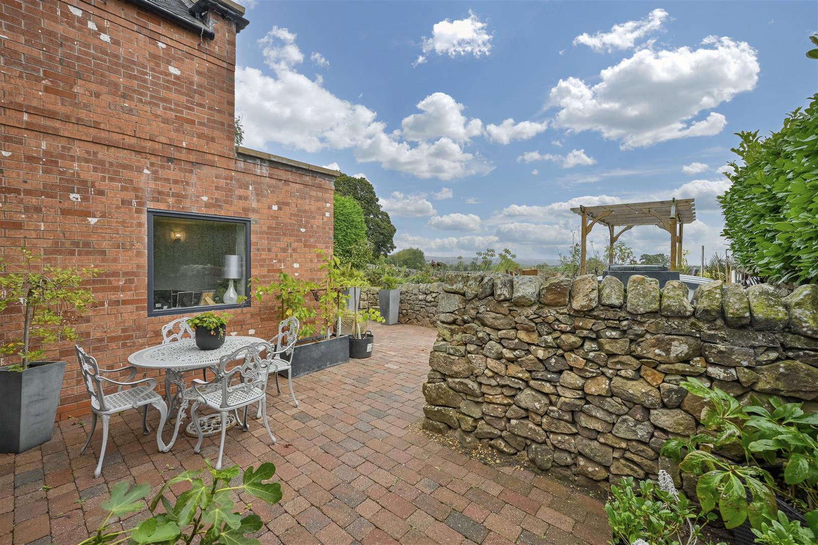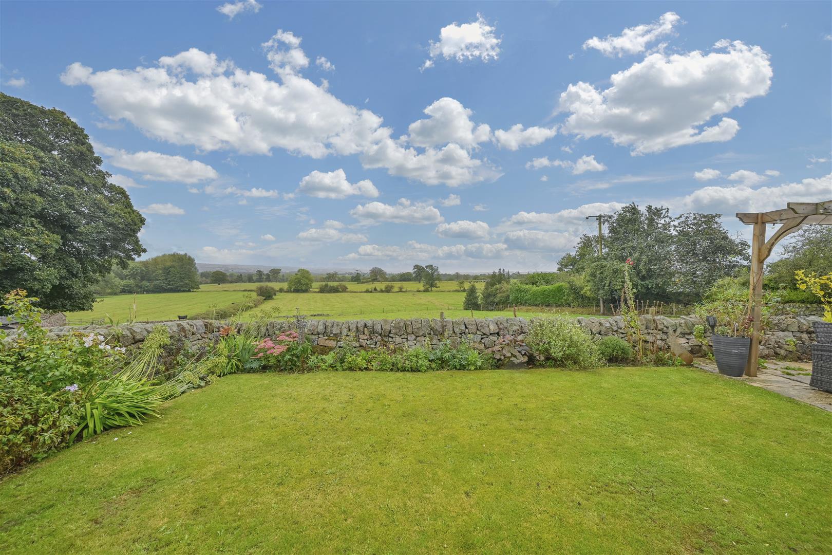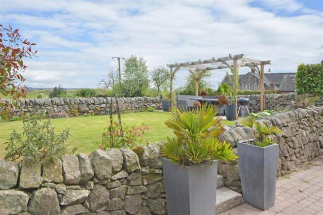 The rear gardens are a standout feature, blending seamlessly with the surrounding countryside. A cobble-effect patio/pathways wraps around the rear and side of the property, creating pleasant seating areas and showcasing the continuation of the dry stone walls. Steps lead up to a garden area primarily laid to lawn, featuring a delightful seating area and flower borders, along with more dry stone walling and a pergola over the seating area.